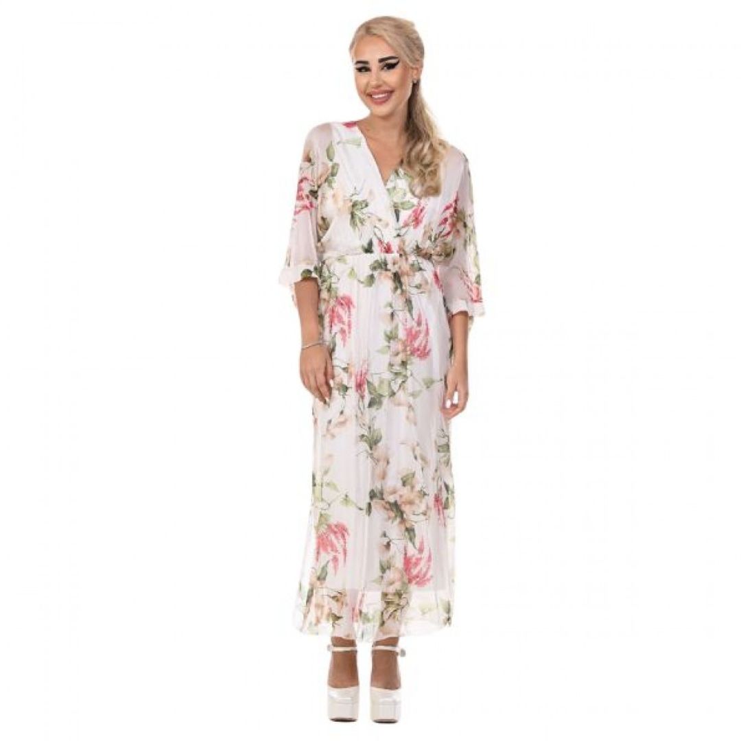 Дизайнът на роклята включва нежна и пастелна цветова палитра, която внася свежест и лекота в облеклото. Флоралният принт е стилен и деликатен, добавяйки усещане за природна красота и романтика към всяка визия. Тази рокля е идеален избор за дамите, които търсят съчетание от комфорт и изтънченост.