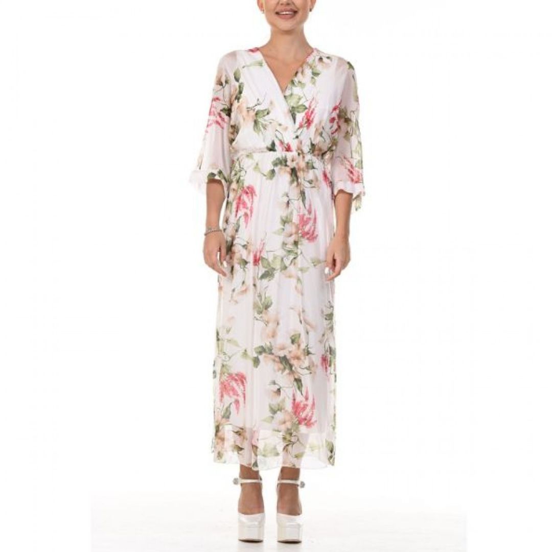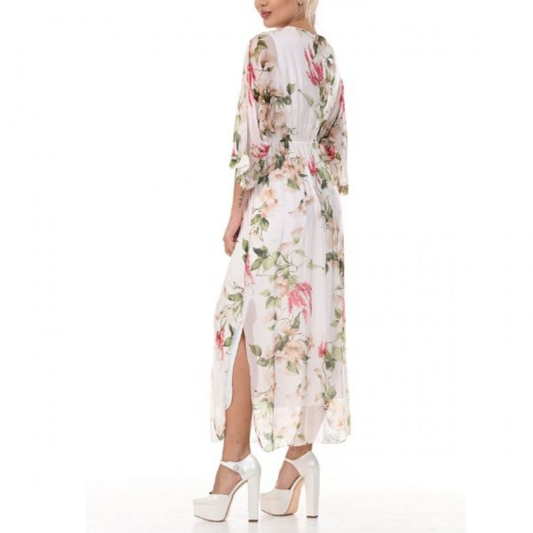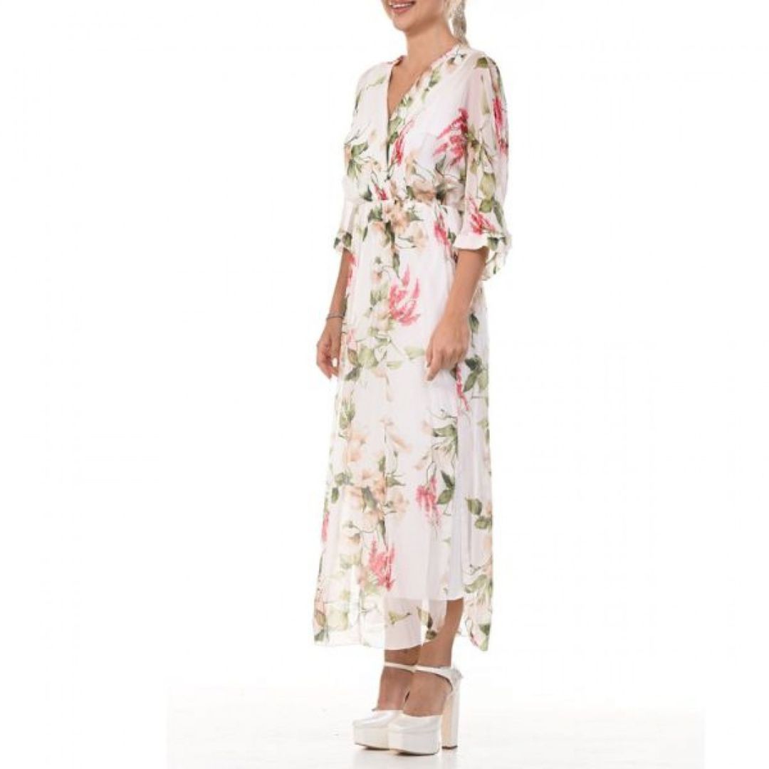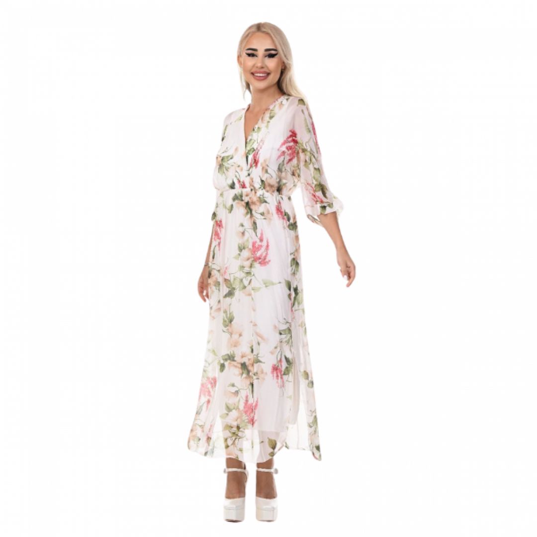 Роклята Yoncy е елегантна и романтична дълга дамска рокля, която привлича вниманието със своя класически флорален принт. Дължината ѝ достига до глезените, което създава изискан и женствен силует, подходящ както за ежедневни разходки, така и за по-специални поводи. Деколтето е V-образно, подчертавайки деликатно врата и деколтето, а 3/4-ръкавите добавят баланс между елегантност и удобство.