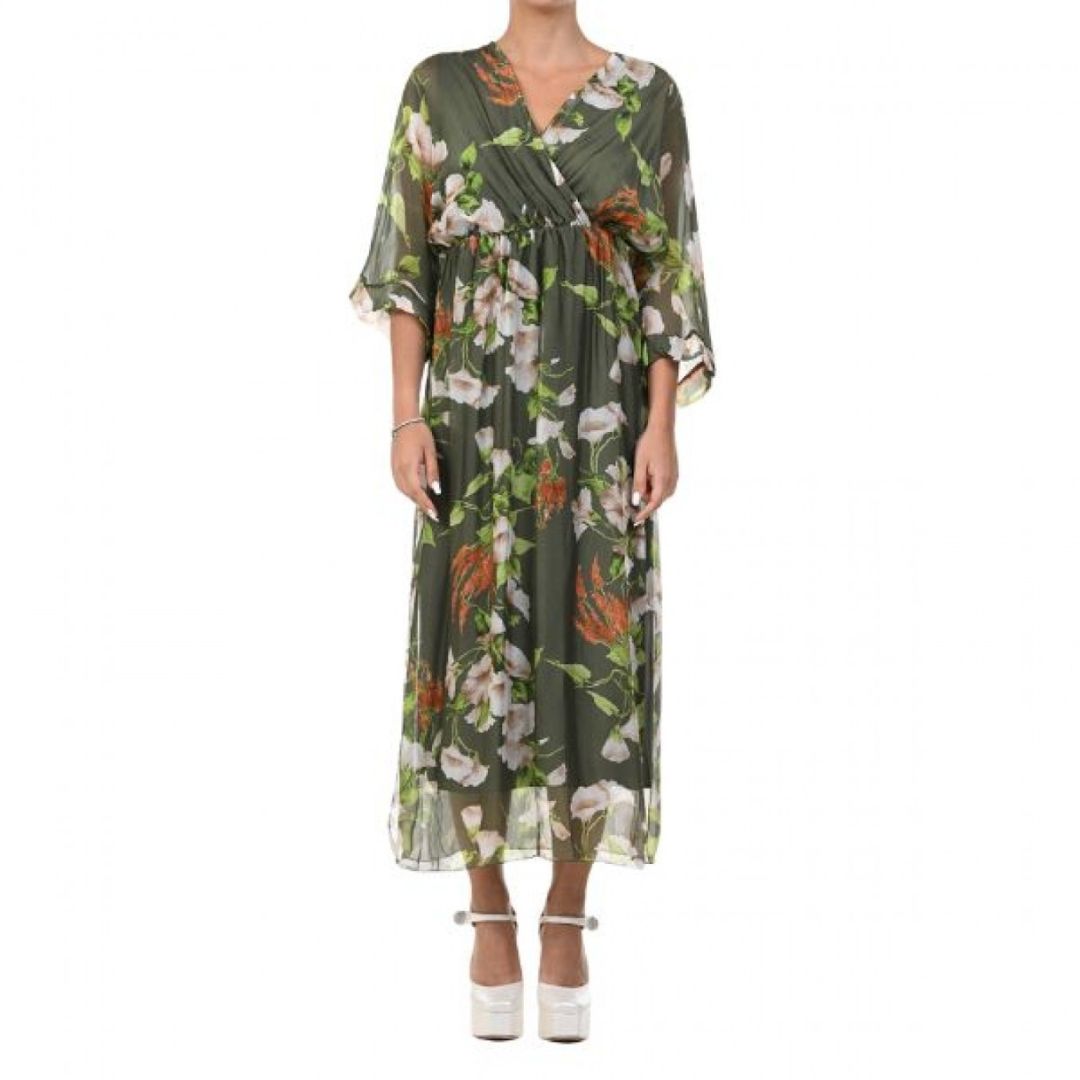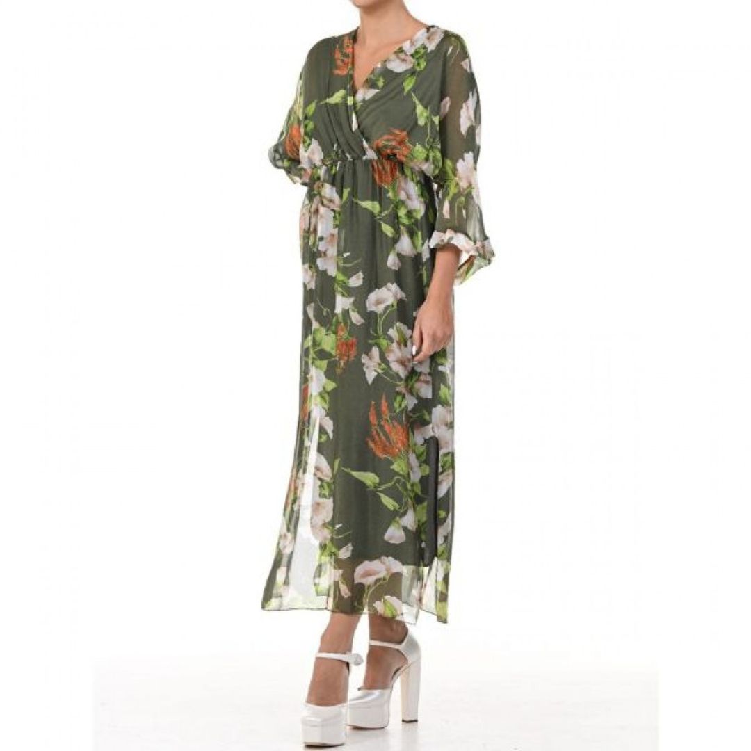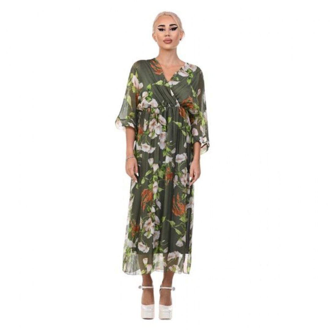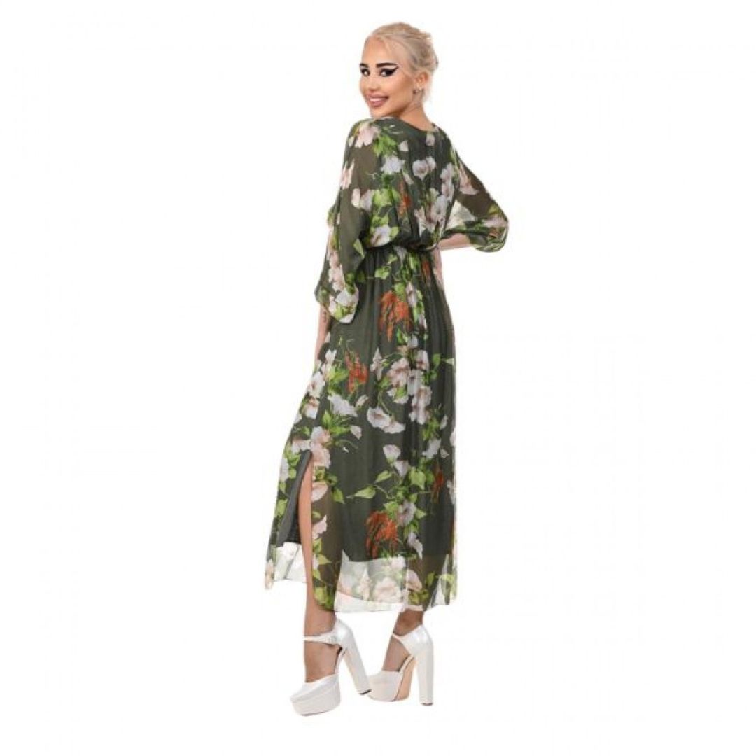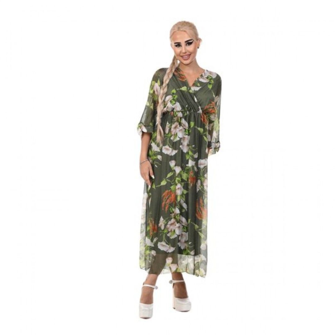 Роклята Yoncy е елегантна и романтична дълга дамска рокля, която привлича вниманието със своя класически флорален принт. Дължината ѝ достига до глезените, което създава изискан и женствен силует, подходящ както за ежедневни разходки, така и за по-специални поводи. Деколтето е V-образно, подчертавайки деликатно врата и деколтето, а 3/4-ръкавите добавят баланс между елегантност и удобство.