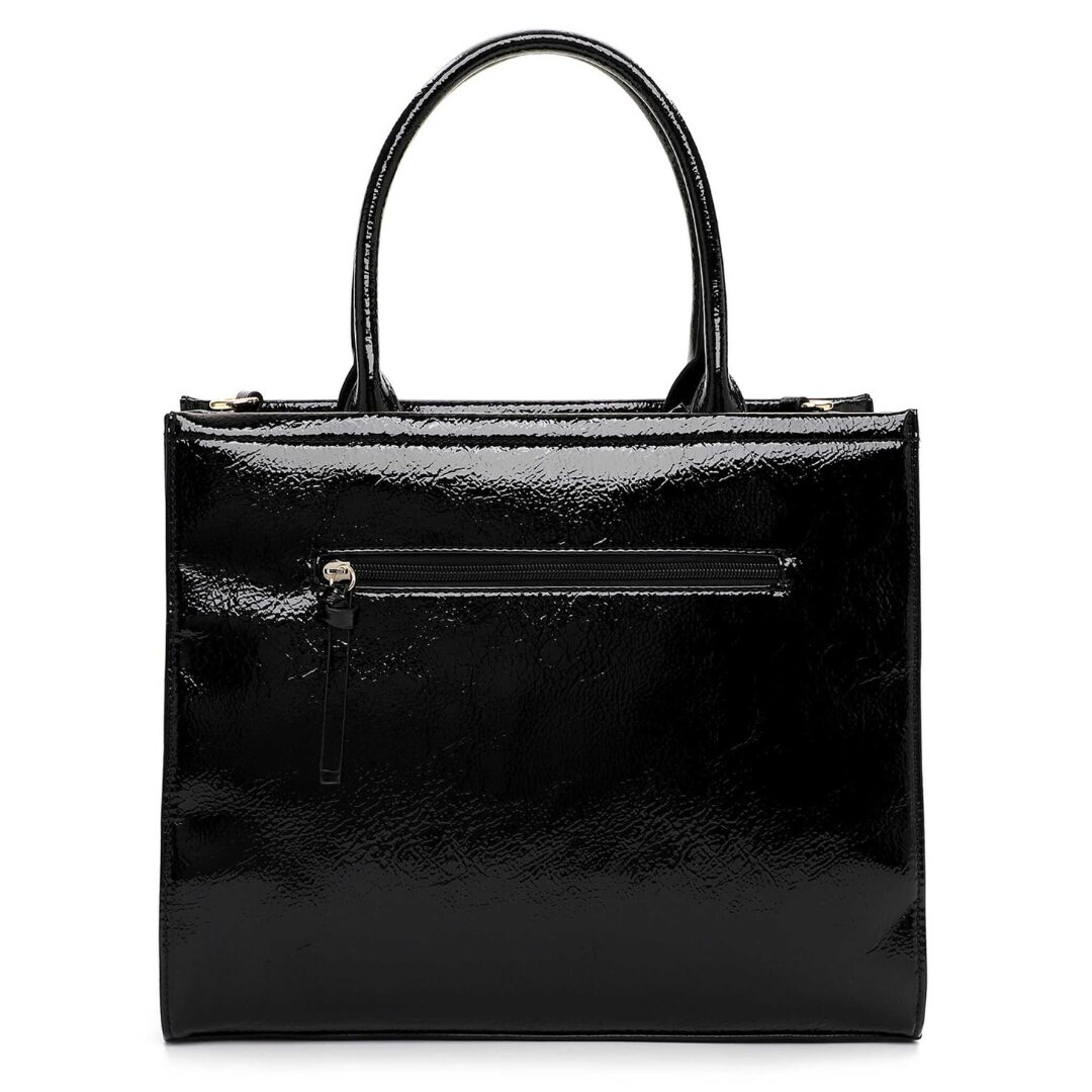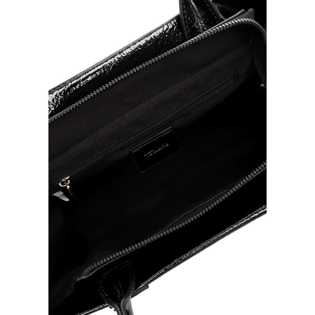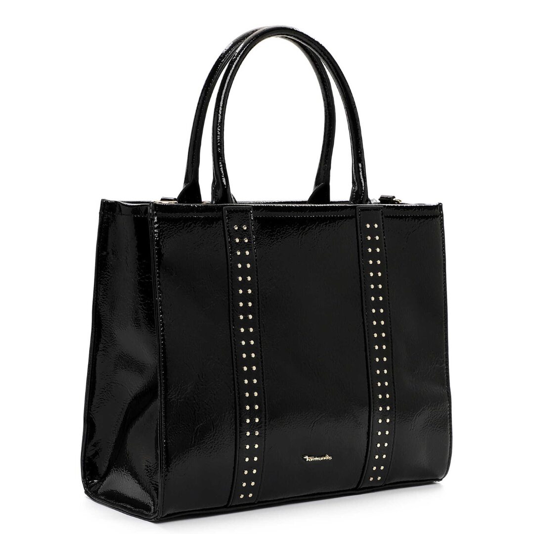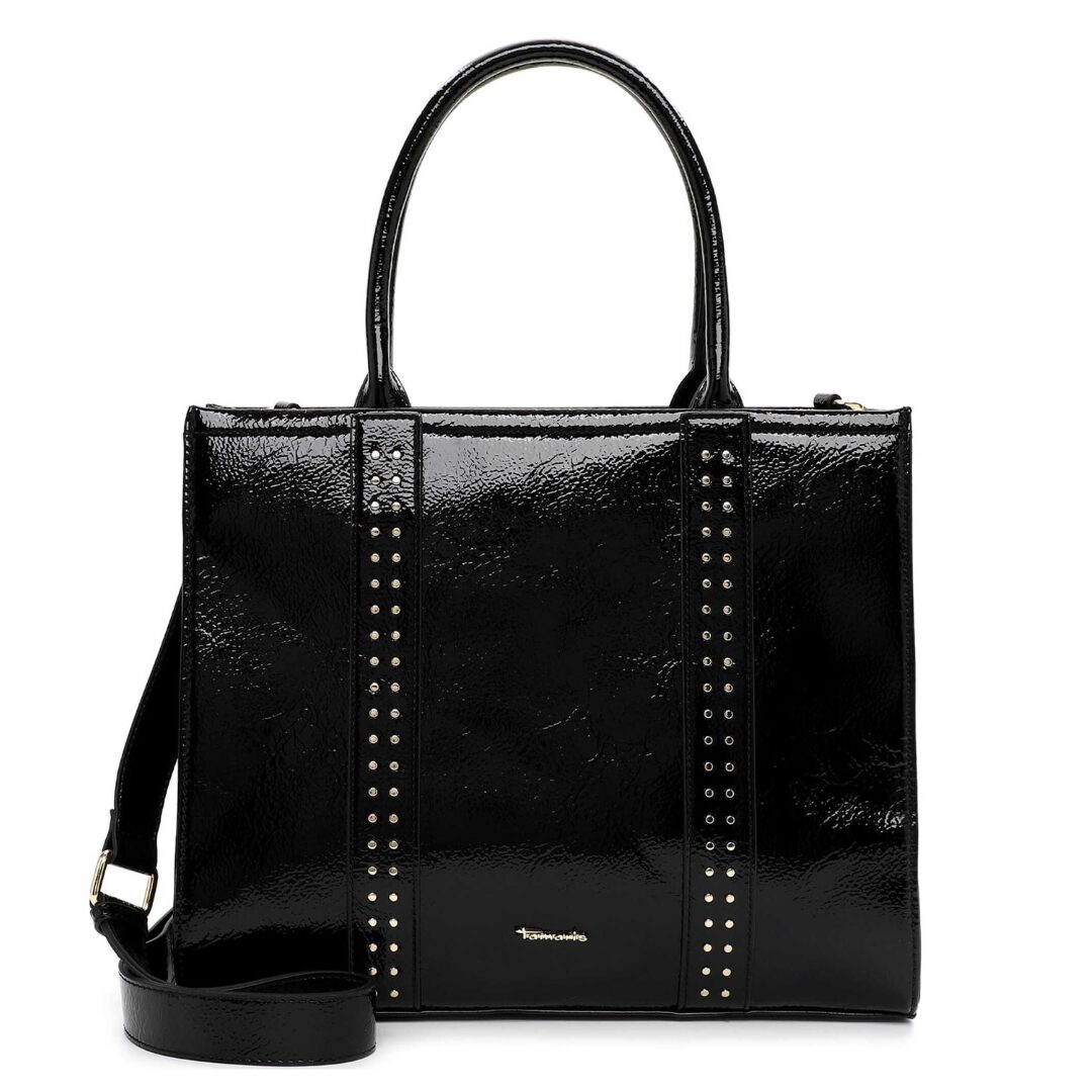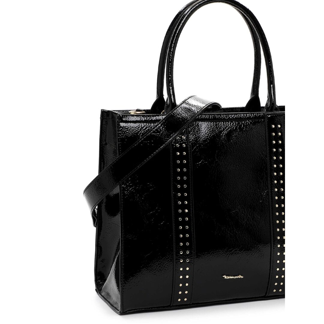 Стилна дамска чанта Tamaris в черен лак с изразителен гланцов ефект. Дизайнът е акцентиран с декоративни метални елементи, които придават модерен и елегантен характер. Чантата предлага къси дръжки и дълга регулируема презрамка за различни начини на носене. Идеален избор за жени, които обичат да съчетават изисканост и съвременен стил.