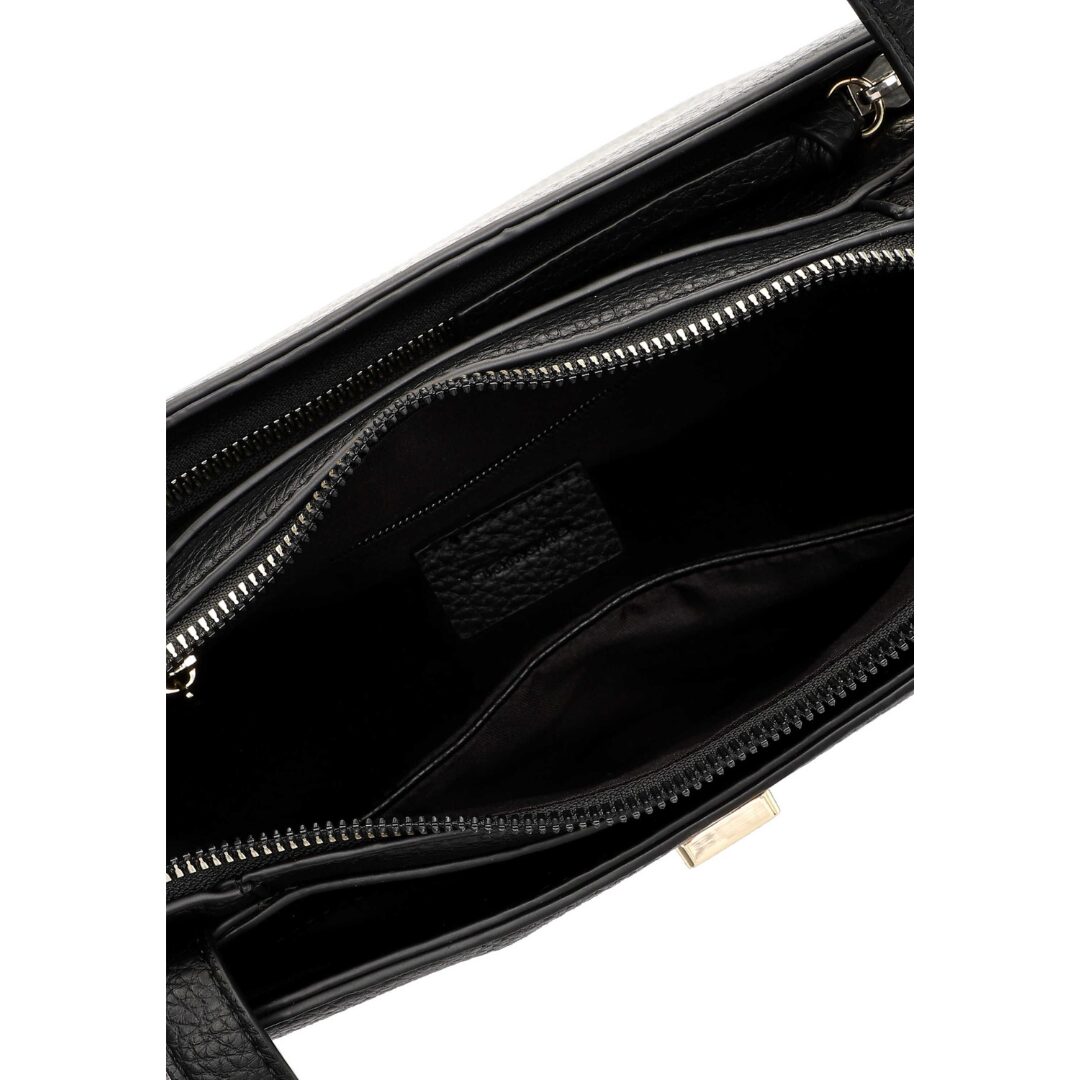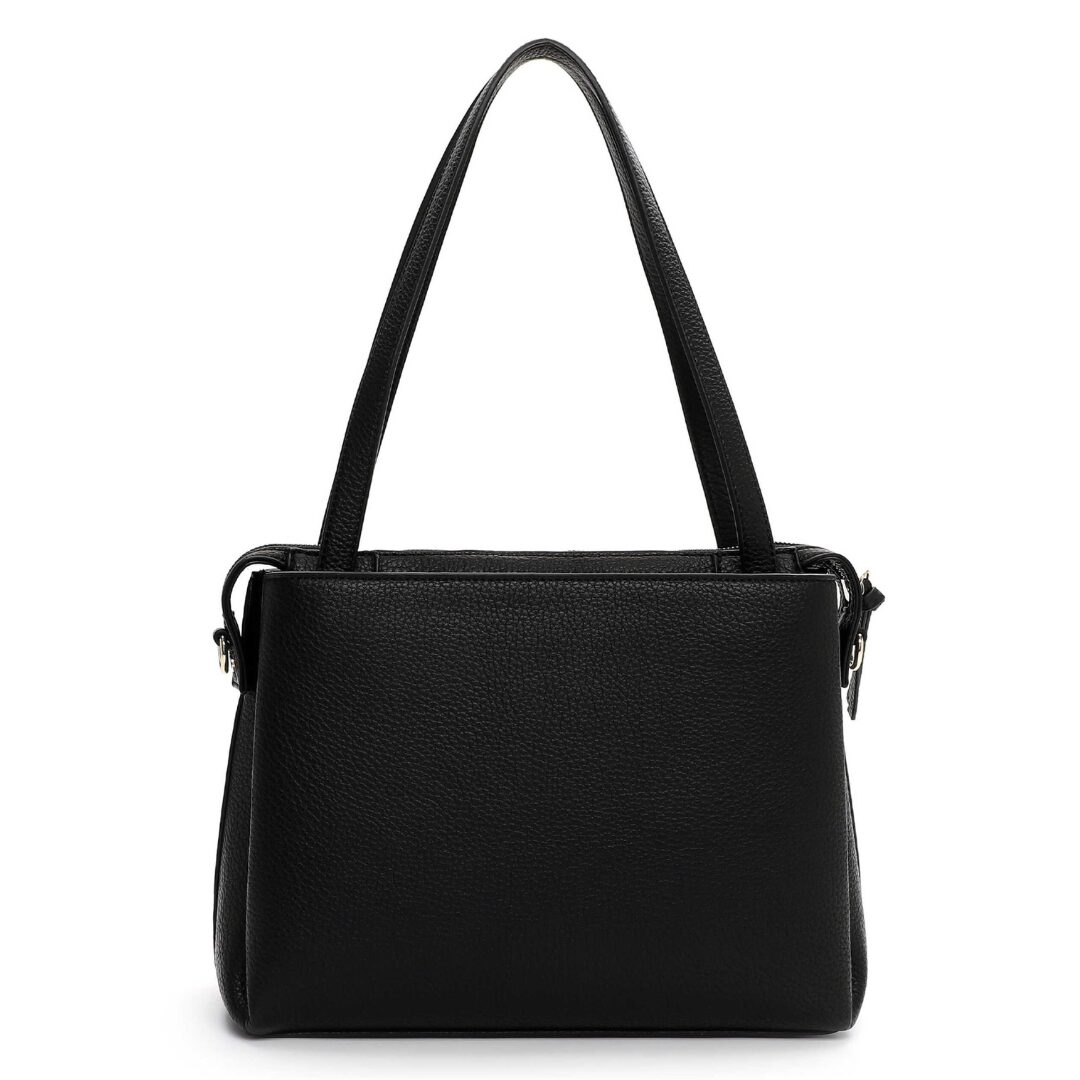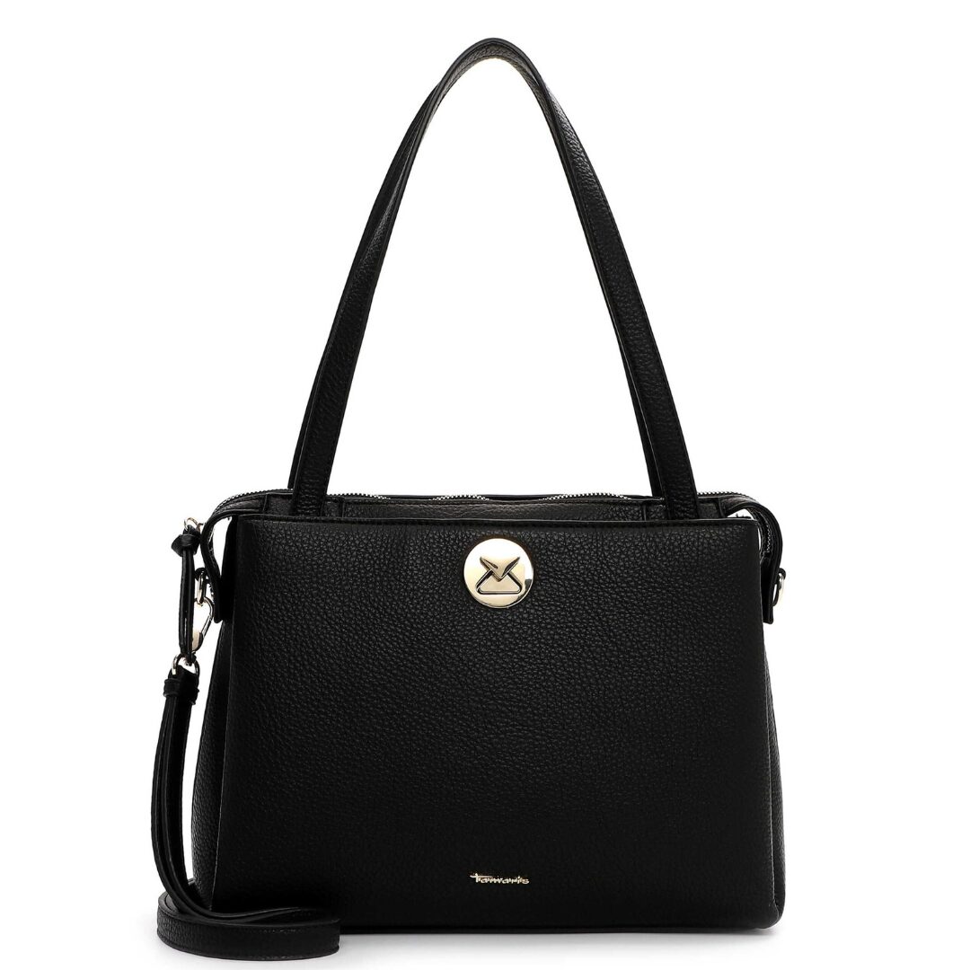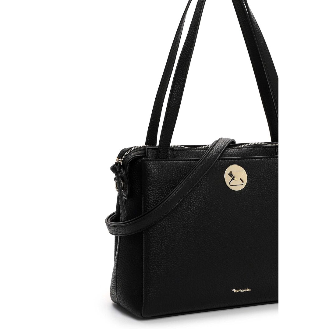 Елегантна дамска чанта Tamaris, изработена от висококачествена еко кожа с фина текстура. Класическият черен цвят е допълнен от златист метален акцент с логото на марката, придаващ изискан завършек. Моделът предлага удобство с дълги дръжки и допълнителна регулируема презрамка, което го прави подходящ както за ежедневието, така и за делови визии.