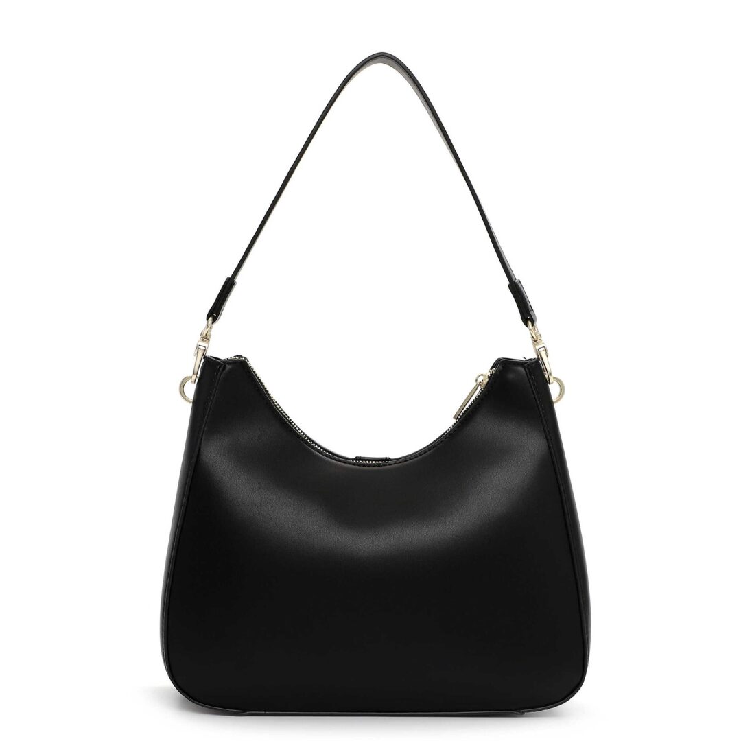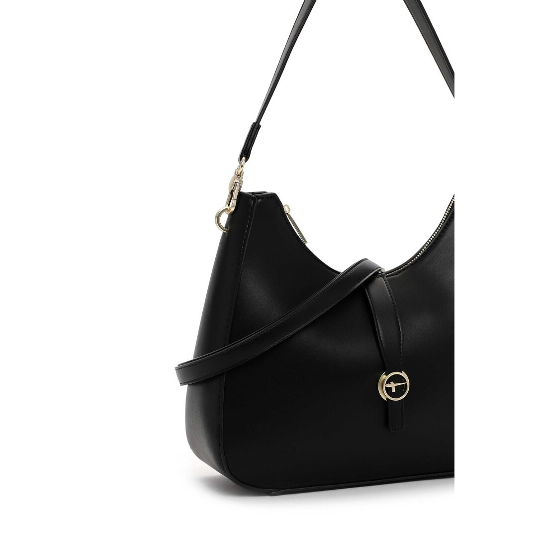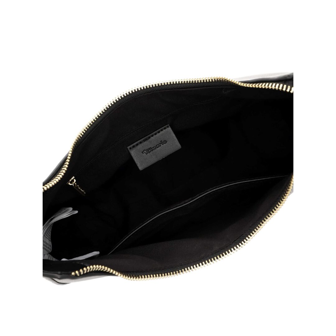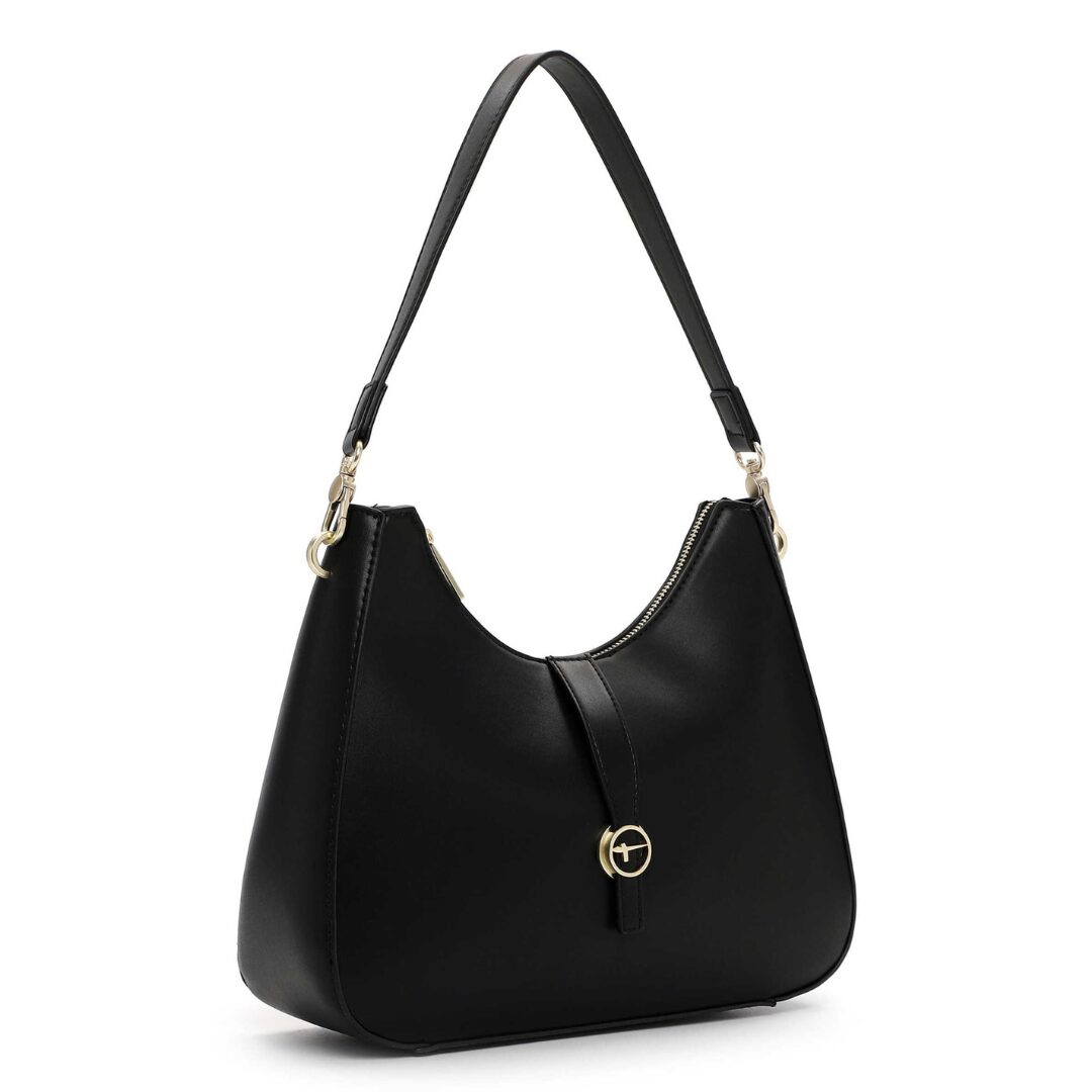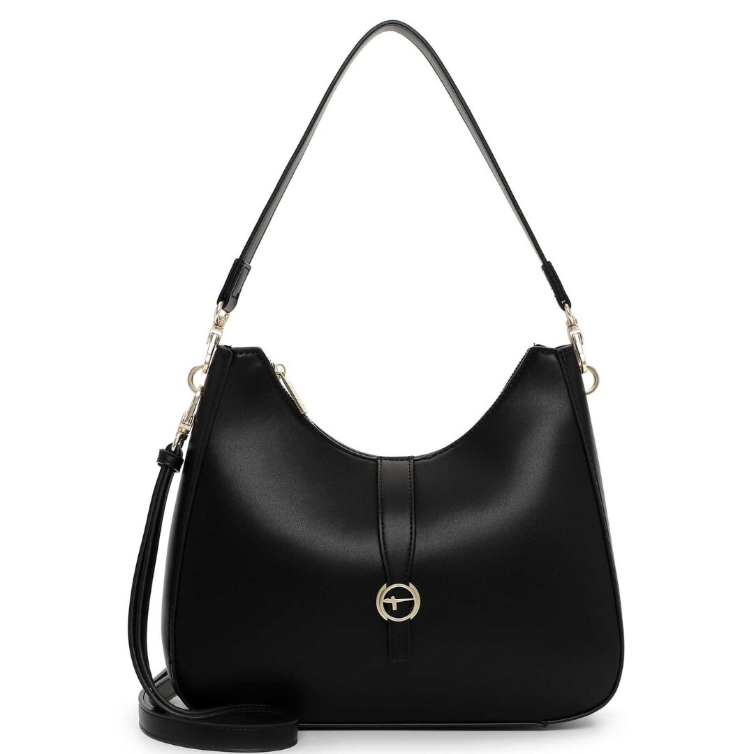Стилна дамска чанта Tamaris в класическо черно, изработена от гладка еко кожа с изтънчен блясък. Моделът се отличава с елегантна извита форма и фин златист акцент отпред. Съчетава къса и дълга регулируема презрамка за повече гъвкавост и удобство. Идеален избор за съвременната жена, която обича семплата елегантност.