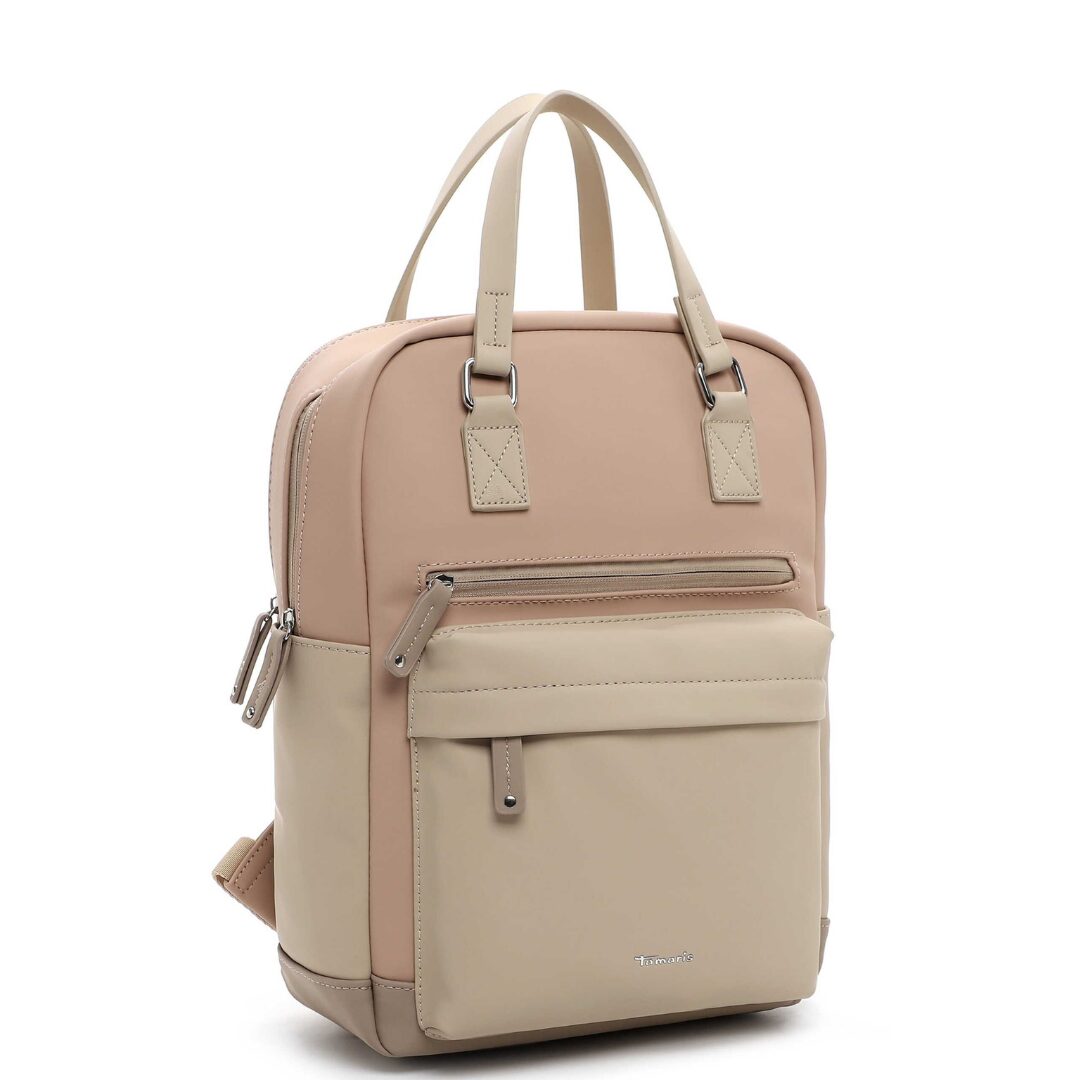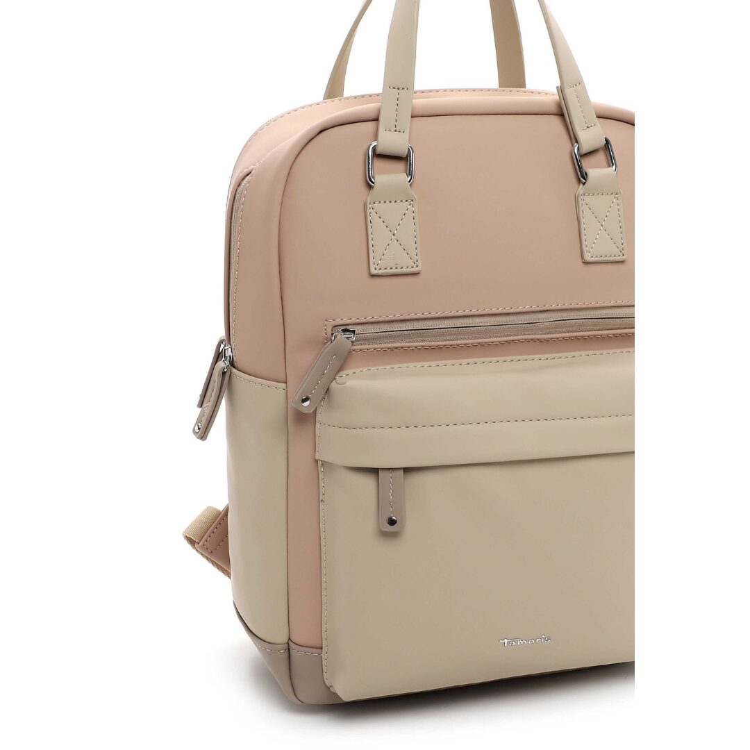 Модерна дамска раница Tamaris в нежна комбинация от бежово и розово. Изработена от висококачествени материали с меко покритие и стилен дизайн. Разполага с предни джобове с цип и практична вътрешна организация, осигуряваща удобство в ежедневието. Перфектен избор за съвременната жена, която цени комфорта и изискания стил.