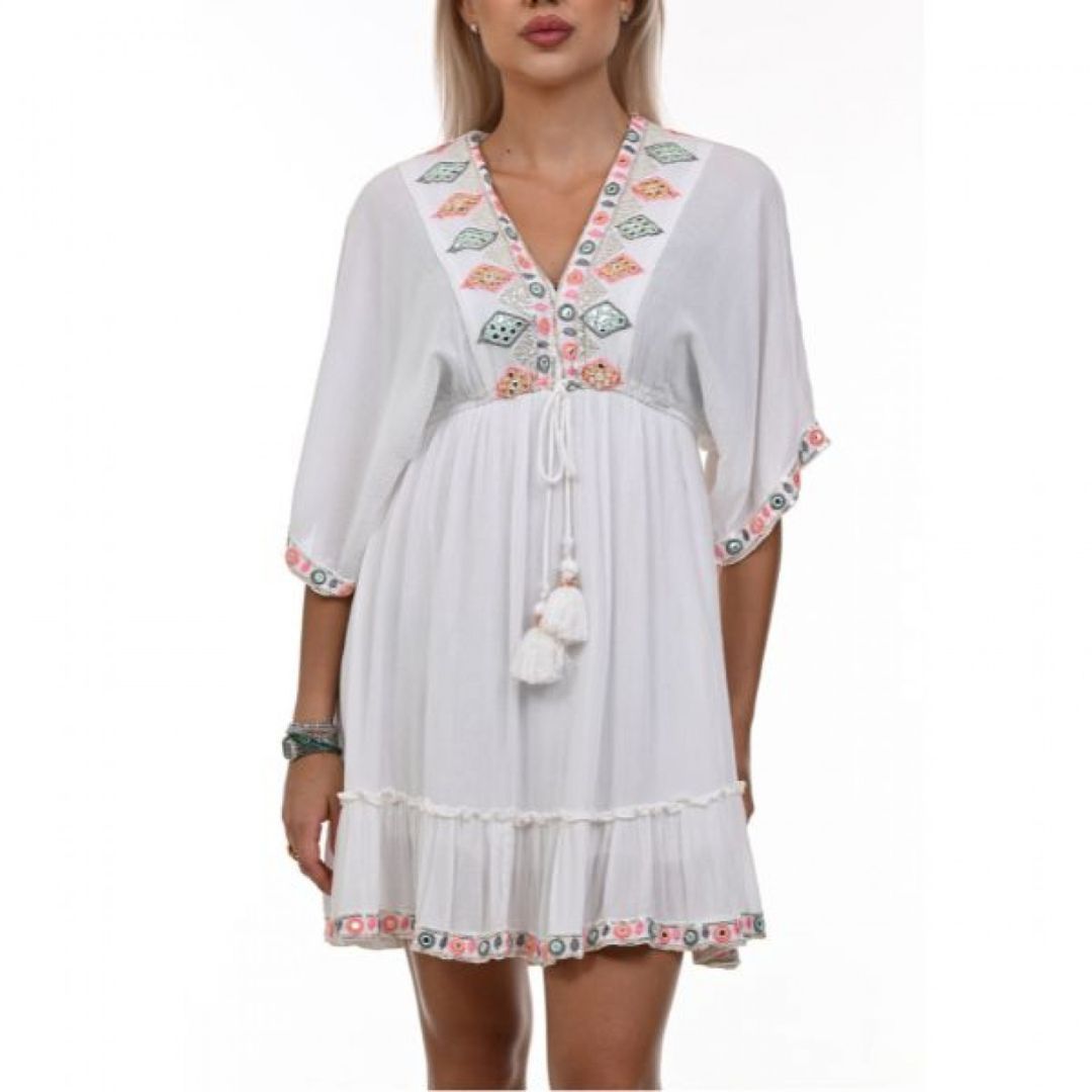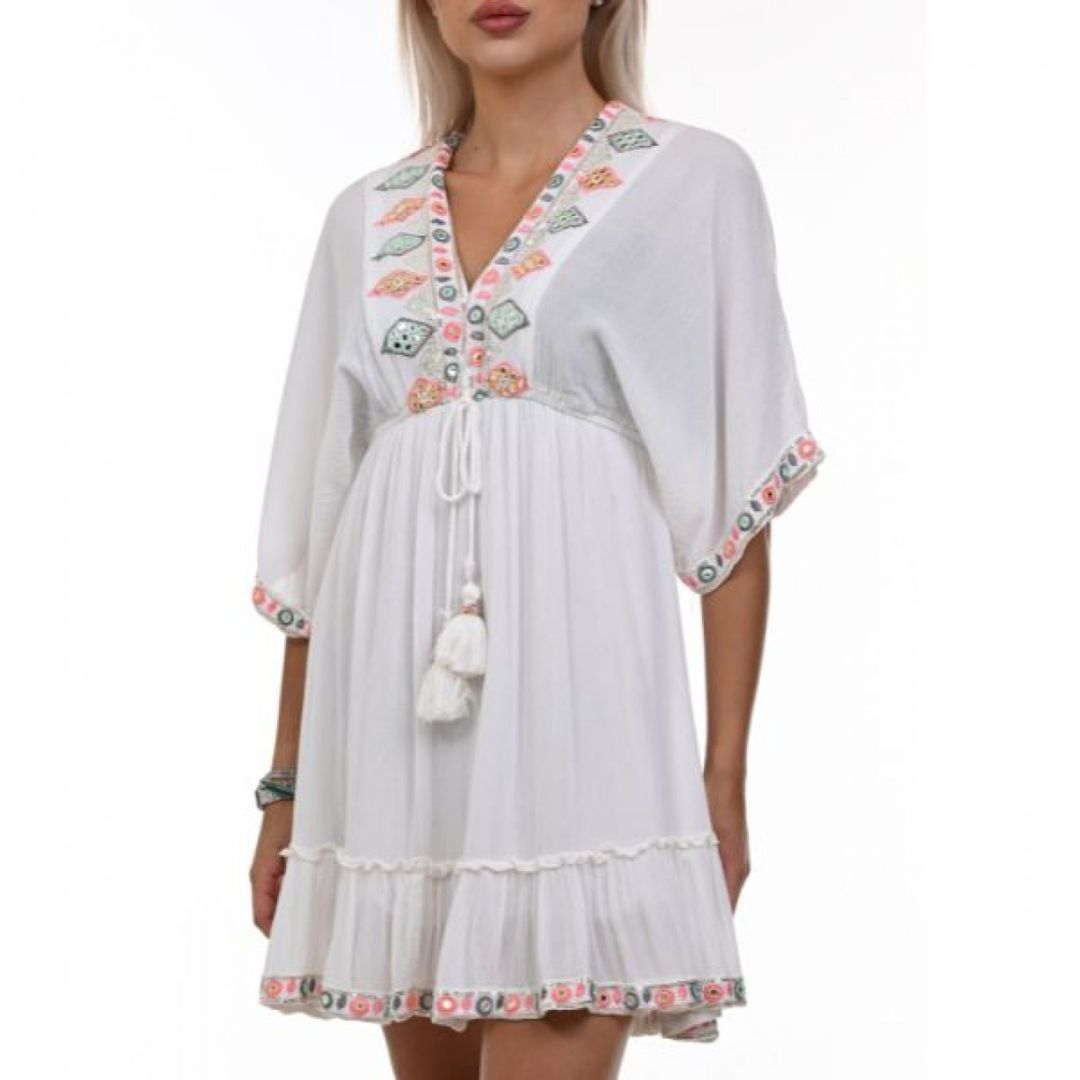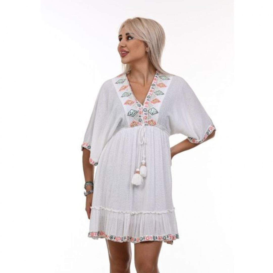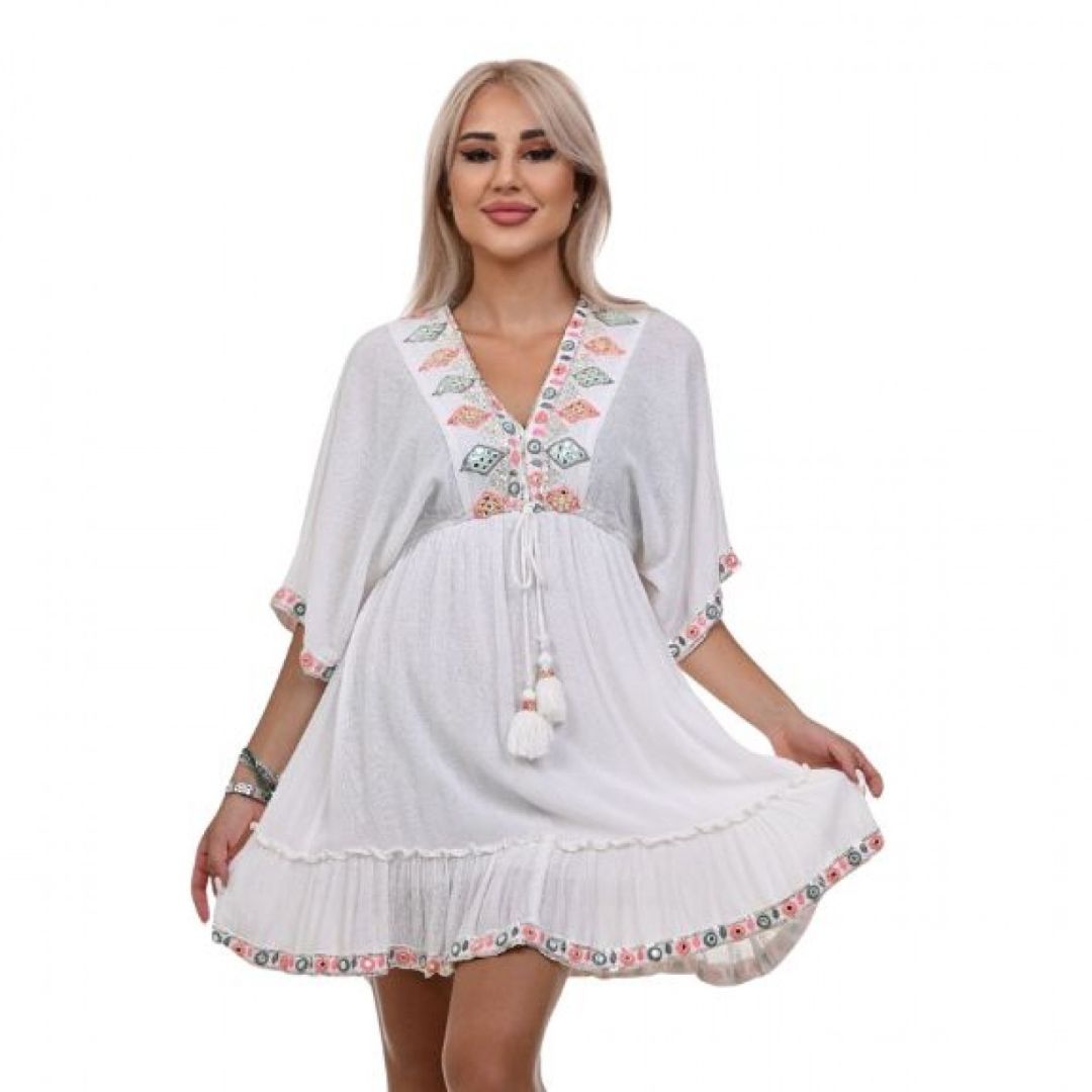 Дамската рокля на марката Yoncy е перфектният избор за лятото. Тази къса бяла рокля с бродерии съчетава елегантност и лекота, което я прави идеална за плажни излизания или летни вечери. Изработена е от леки и дишащи материи, осигуряващи удобство и прохлада през горещите дни. Дизайнът на роклята се отличава с красиви геометрични бродерии, които добавят уникалност и стил. Свободната кройка позволява леко вталяване, което подчертава фигурата и добавя допълнителен комфорт. Тази рокля е идеална за жени, които искат да изглеждат модерно и свежо през летния сезон.