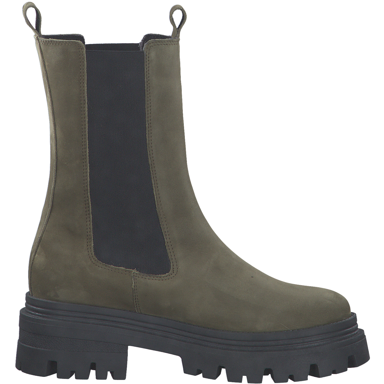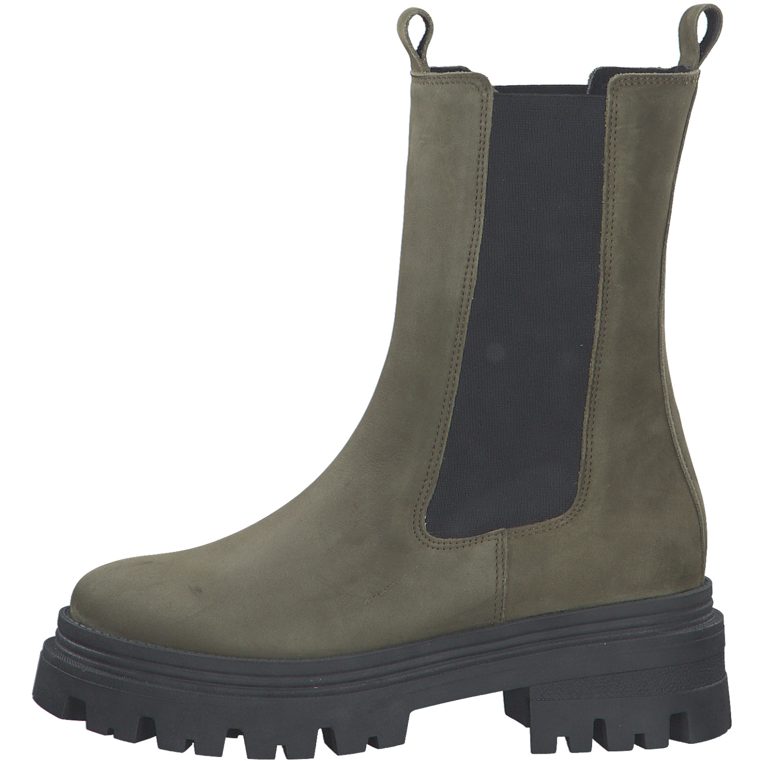 Дамски ботуши от немската марка Tamaris. Външната част на модела е изработена от висококачествена, естествена кожа (набук) и синтетични материали. Вътрешната част е изработена от антибактериален текстил. Височината на подметката в задната част е 5,5см. Моделът се обува лесно благодарение на стреч материята.