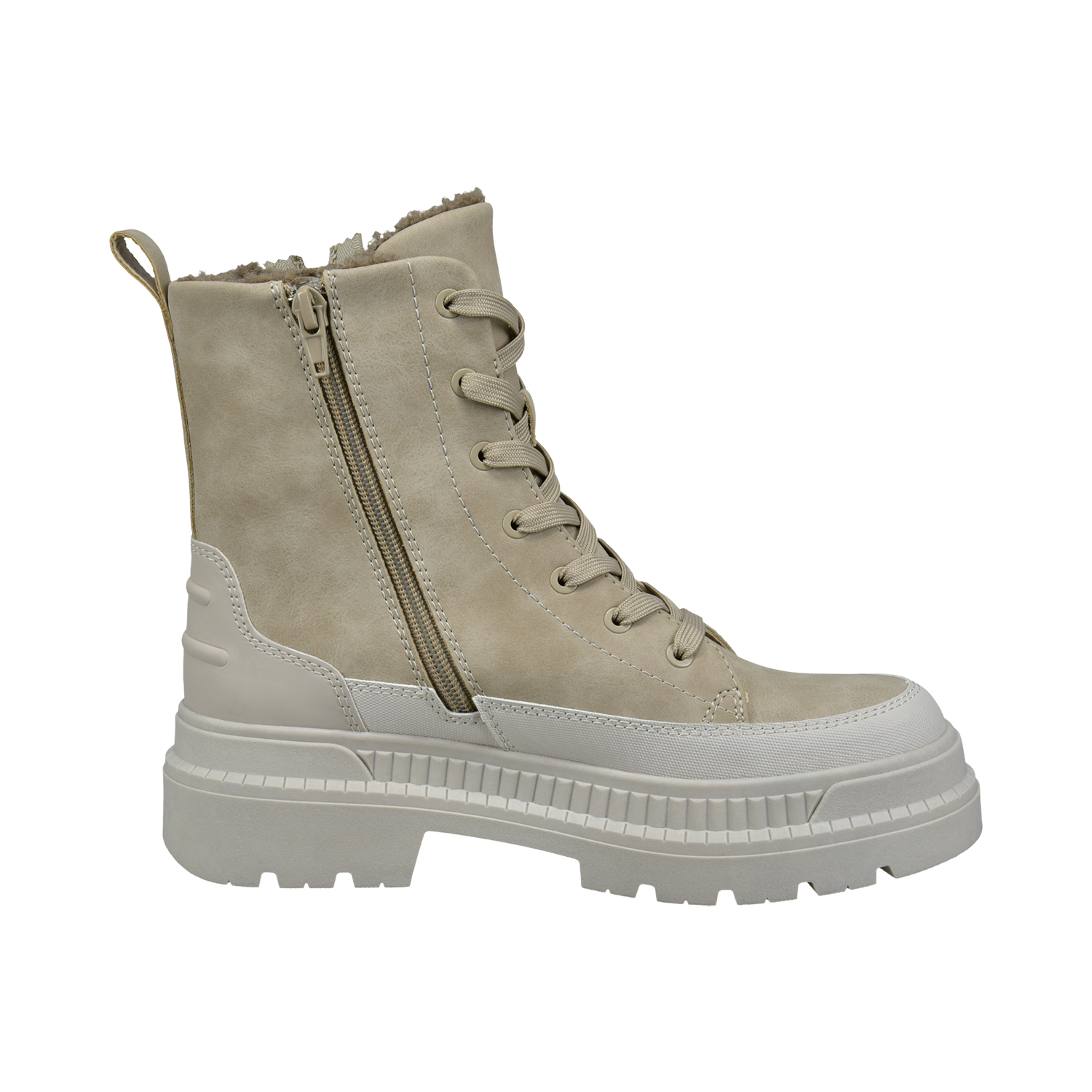 Външна част е изработена от еко кожа, която придава на ботите модерна визия и устойчивост. Вътрешна част се състои от мек текстил за допълнителен комфорт през целия ден. Практичен дизайн с връзки и цип за лесно обуване и добро прилягане.