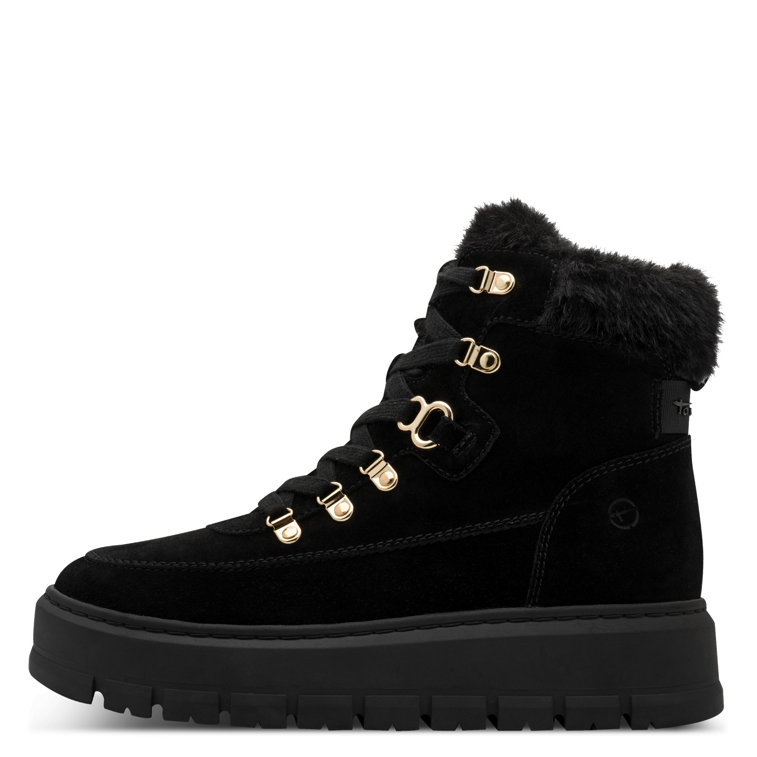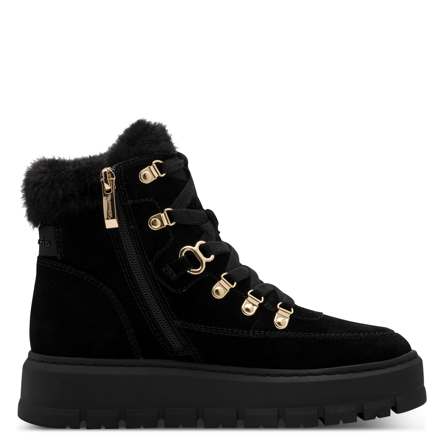 Тези черни боти Tamaris съчетават модерна визия с практична функционалност – идеални за студените дни. Изработени от висококачествен велур с топла подплата, те осигуряват уют и комфорт през целия ден. Декоративните златисти елементи при връзките придават изискан акцент, а стабилната подметка гарантира сигурна стъпка дори при зимни условия. Перфектният избор за дамите, които искат да изглеждат стилно, без да правят компромис с удобството.