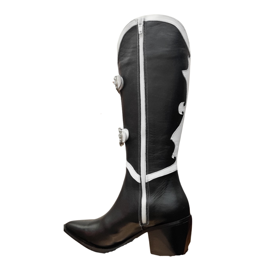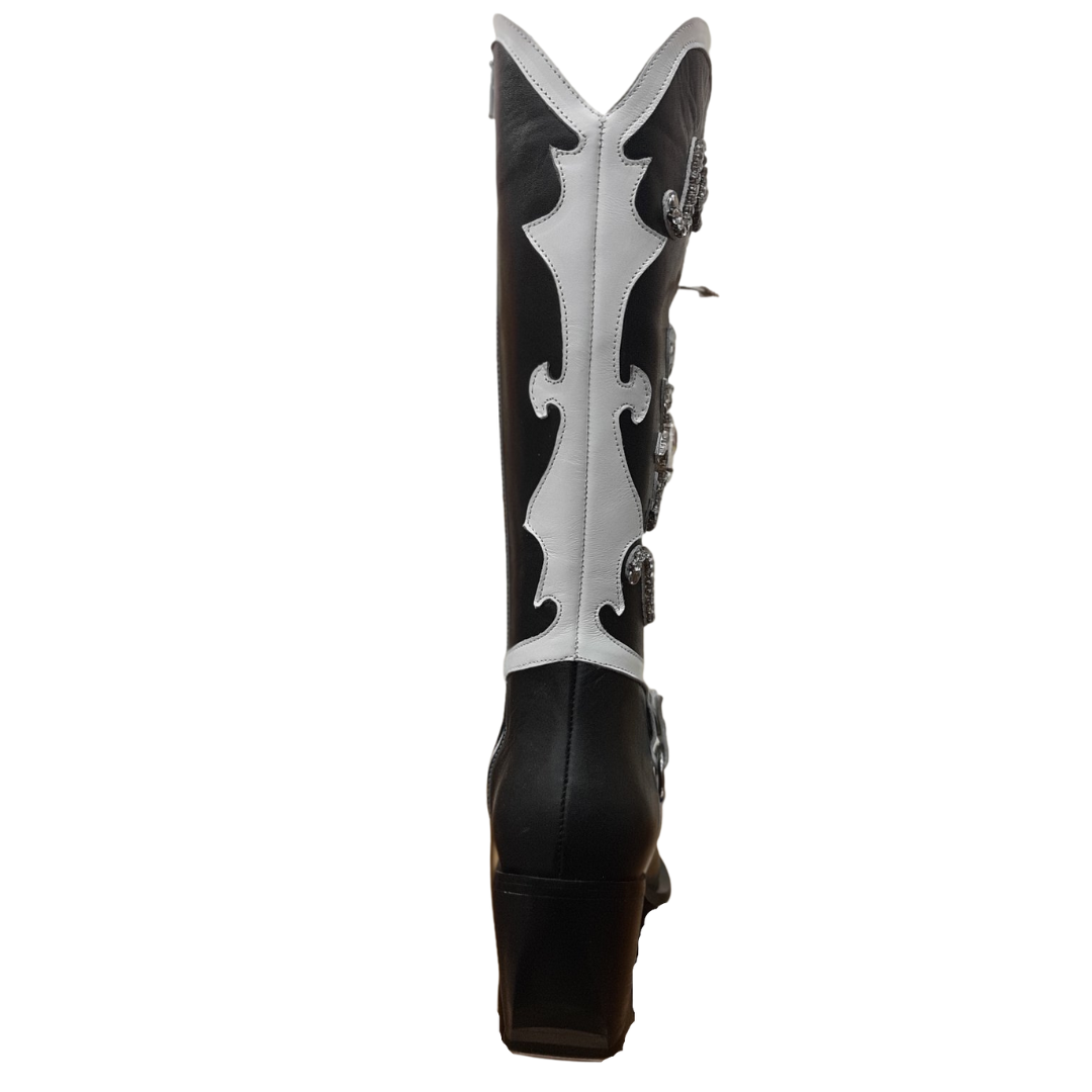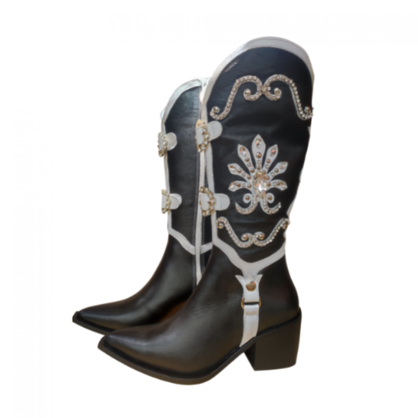 Нашите украсени ботуши Cowgirl предлагат целия блясък, който ще ви накара да откраднете шоуто. Тези ръчно изработени ботуши от естествена кожа имат красива подредба от кристали, шипове и бели украси. Включва естествена кожа от свинска кожа, заострен пръст, метална сребърна облицовка, цип по цялата дължина, две кръгли катарами за колан отпред, с абстрактни декорации, състоящи се от кристали, златни шипове и голям кристал във формата на маркиз.
