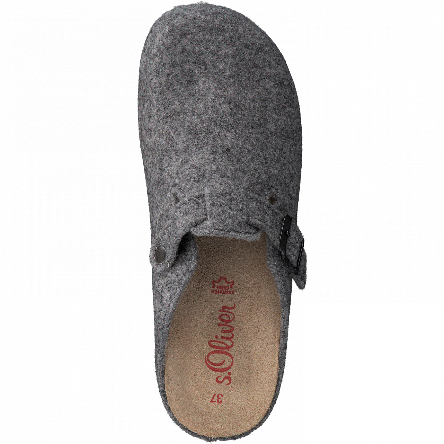 Дамски домашни чехли от марката s.Oliver. Външната част е изработена от текстилни материали. Вътрешната част се състои от текстилни материали и мека, анатомична стелка от естествена кожа. Височината на ходилото в задната част е 2.5см.