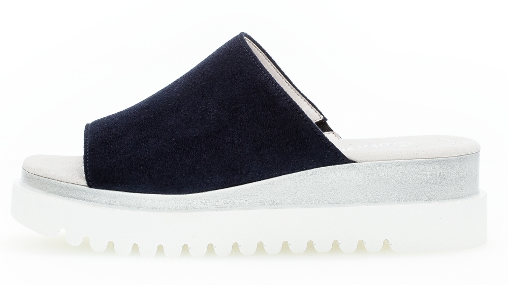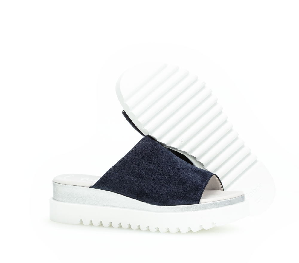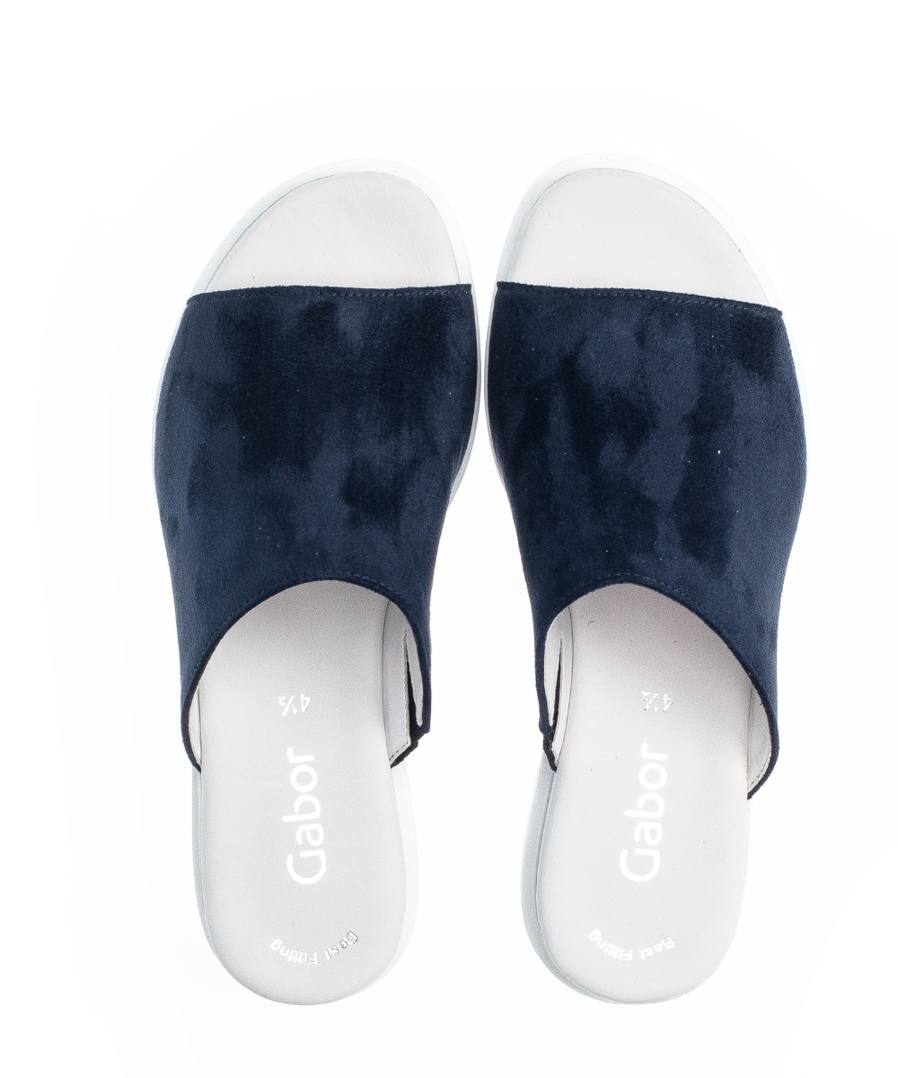 Дамски чехли от немската марка Gabor. Външната част е изработена антибактериален текстил. Вътрешната част се състои от естествена кожа и синтетични материали с комфортни Вest Fitting стелки. Височината на подметката е 5см.