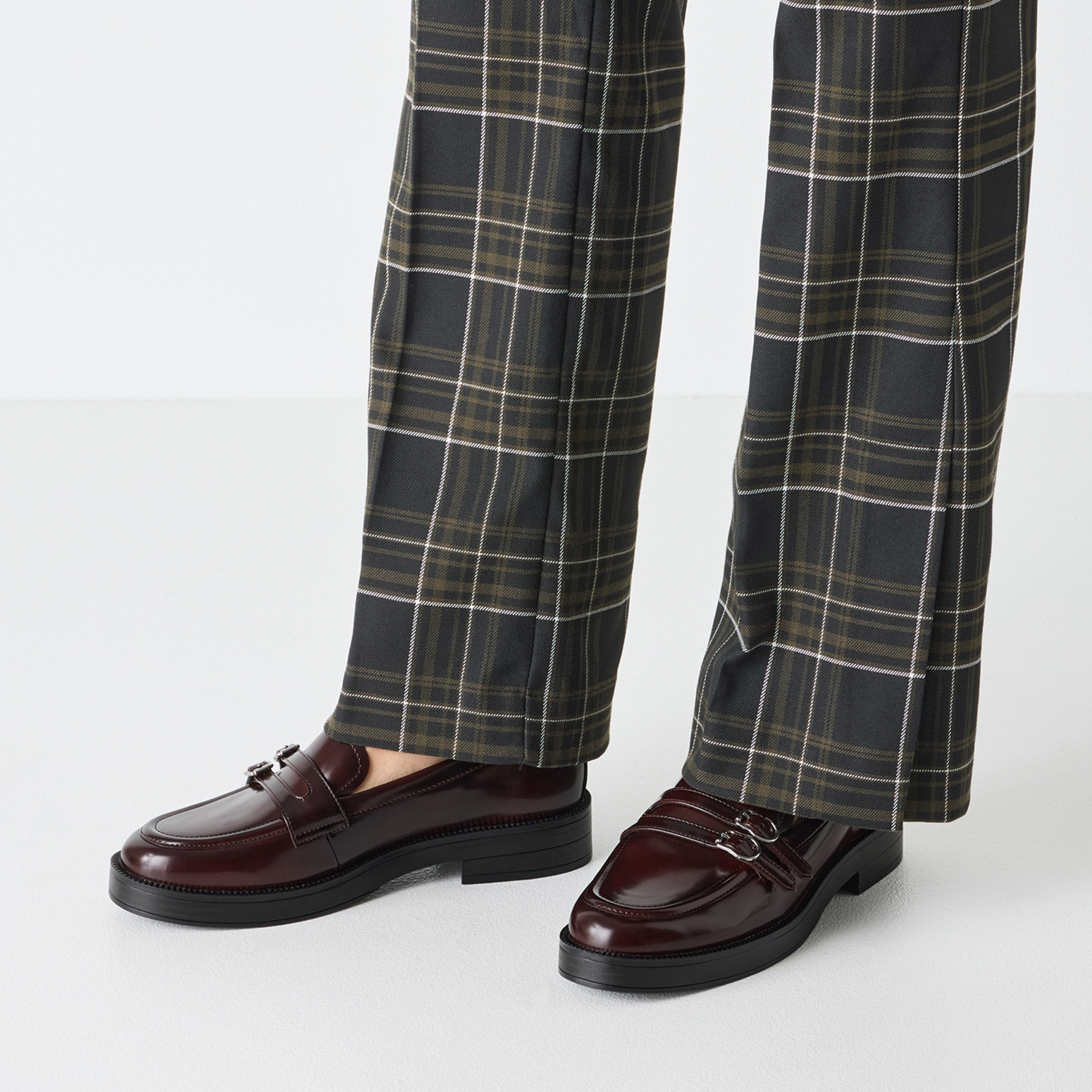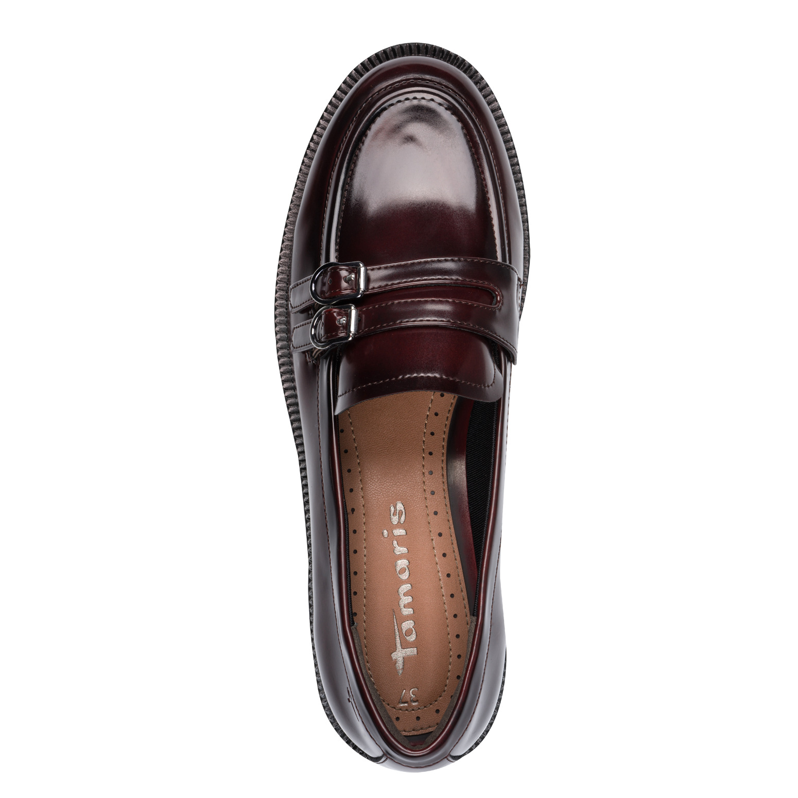 ✔ Дизайн: класически лофер в бордо с декоративни каишки и метални катарами