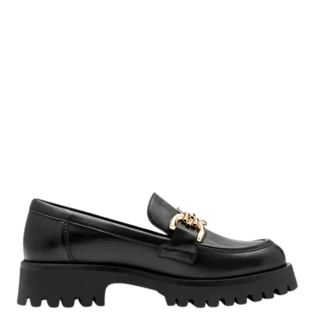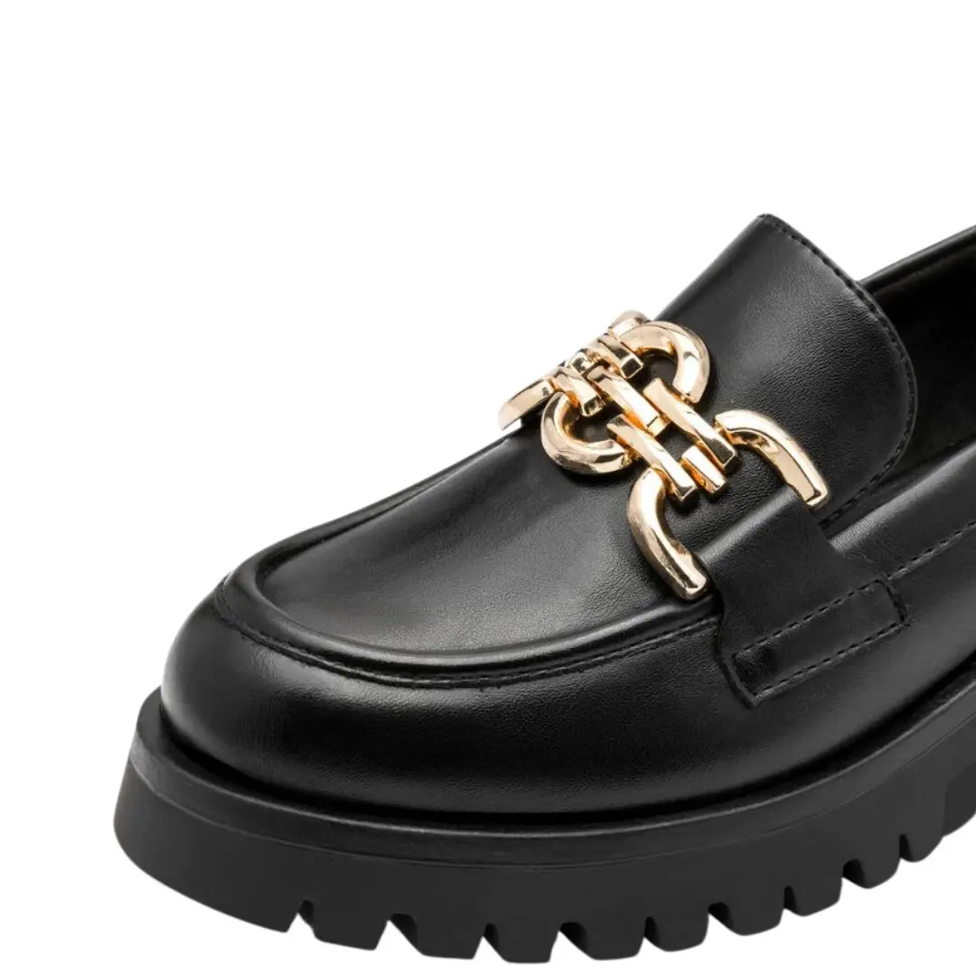 ✔ Дизайн: класически черен цвят, комбиниран с текстилна горна част и масивна декоративна метална катарама в златисто, придаваща луксозен акцент