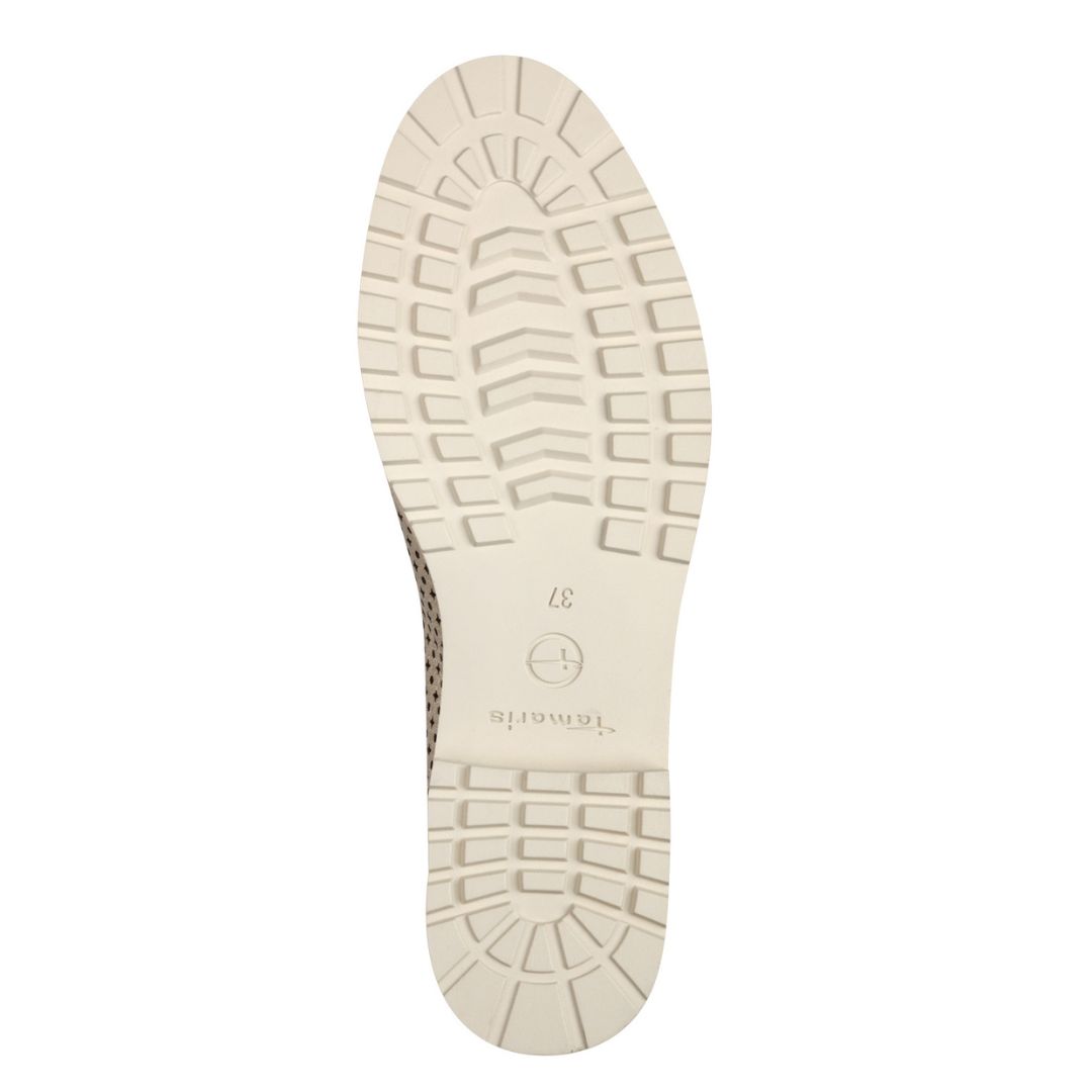 Дамски ежедневни обувки от немската марка Tamaris. Изработени от перфофирана естествена кожа а вътрешната част е от висококачествени еко-кожа и текстил. Стелките са с мемори пяна покрити с естествена кожа. Височината на подметката в задната част е 2см.