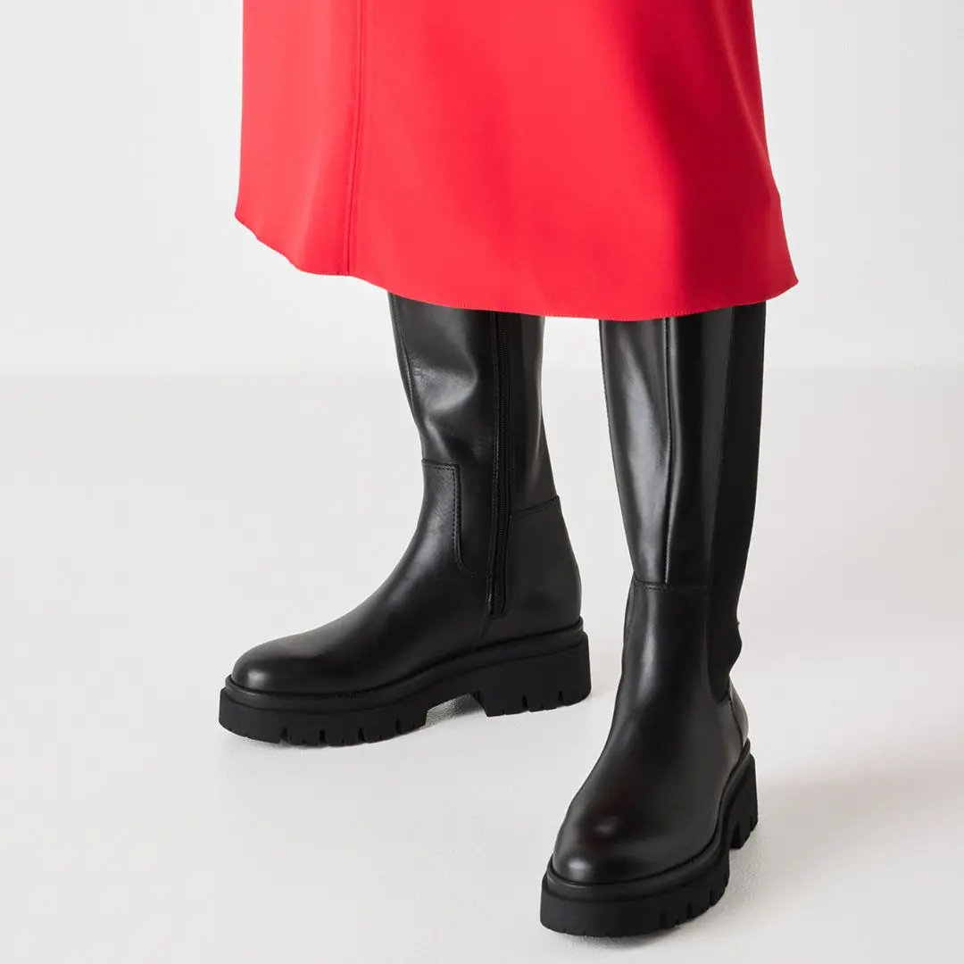 Вътрешната част от текстил гарантира комфорт и приятно усещане при продължително носене. Моделът е оборудван с удобен страничен цип, който улеснява обуването, както и ластична вложка, осигуряваща гъвкавост и адаптиране към различни ширини на подбедрицата.