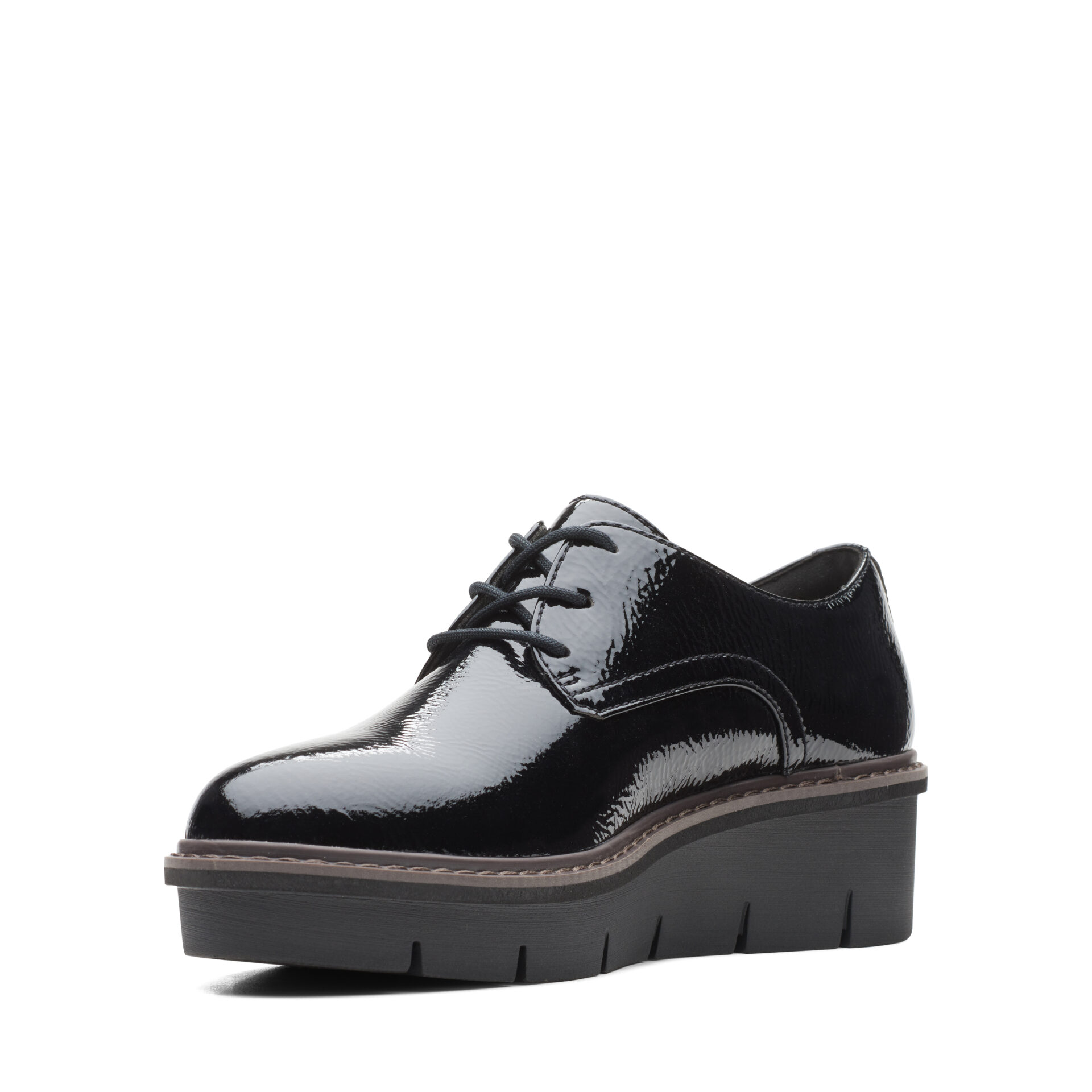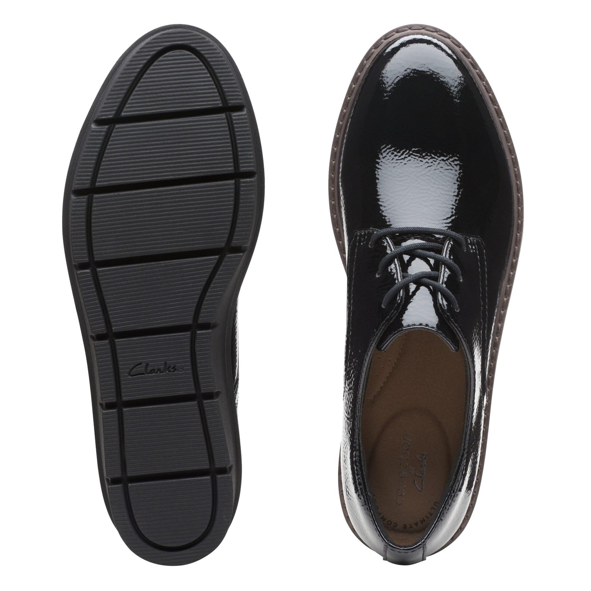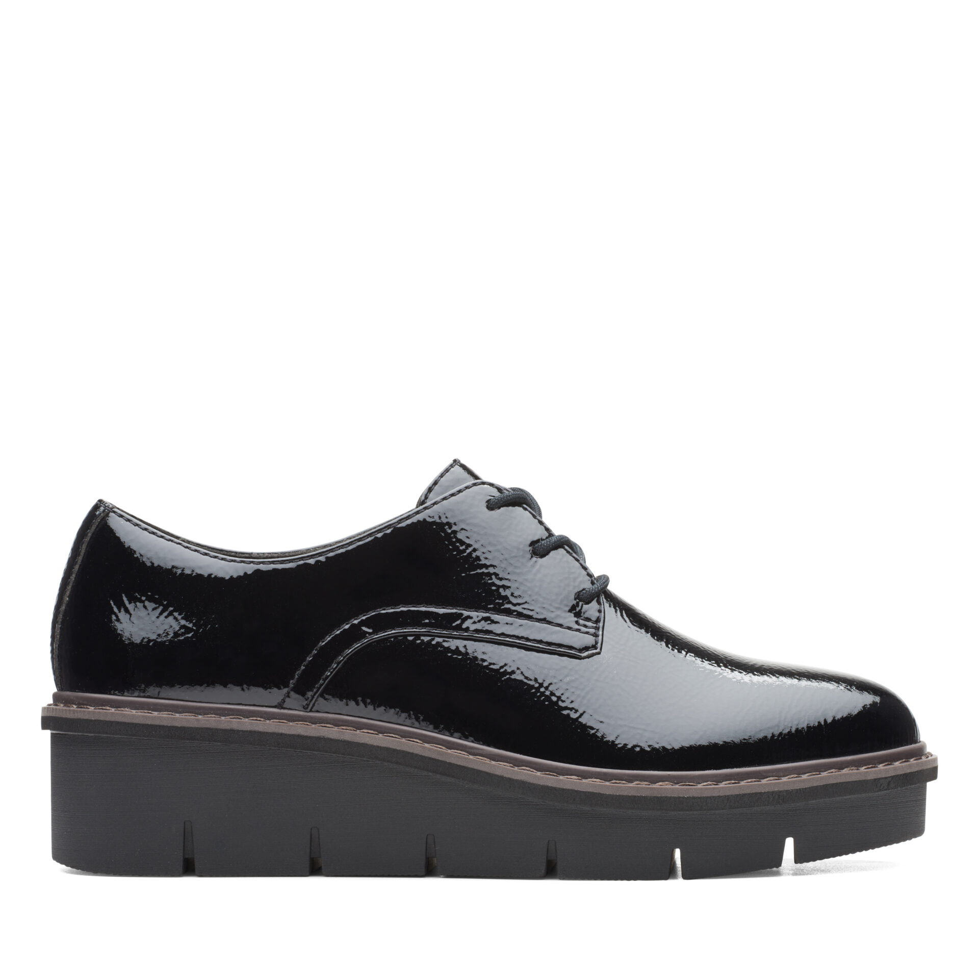 Дамски обувки от английската марка Clarks. Външната част е изработена от висококачествена, еко кожа покрита с лак. Вътрешната част е изработена от антибактериални, текстилни материали. Пристягат се лесно с връзки. Височината на ходилото в задната част е 3см – полезна и удобна височина. Стилен и удобен модел със анатомично оформена стелка.