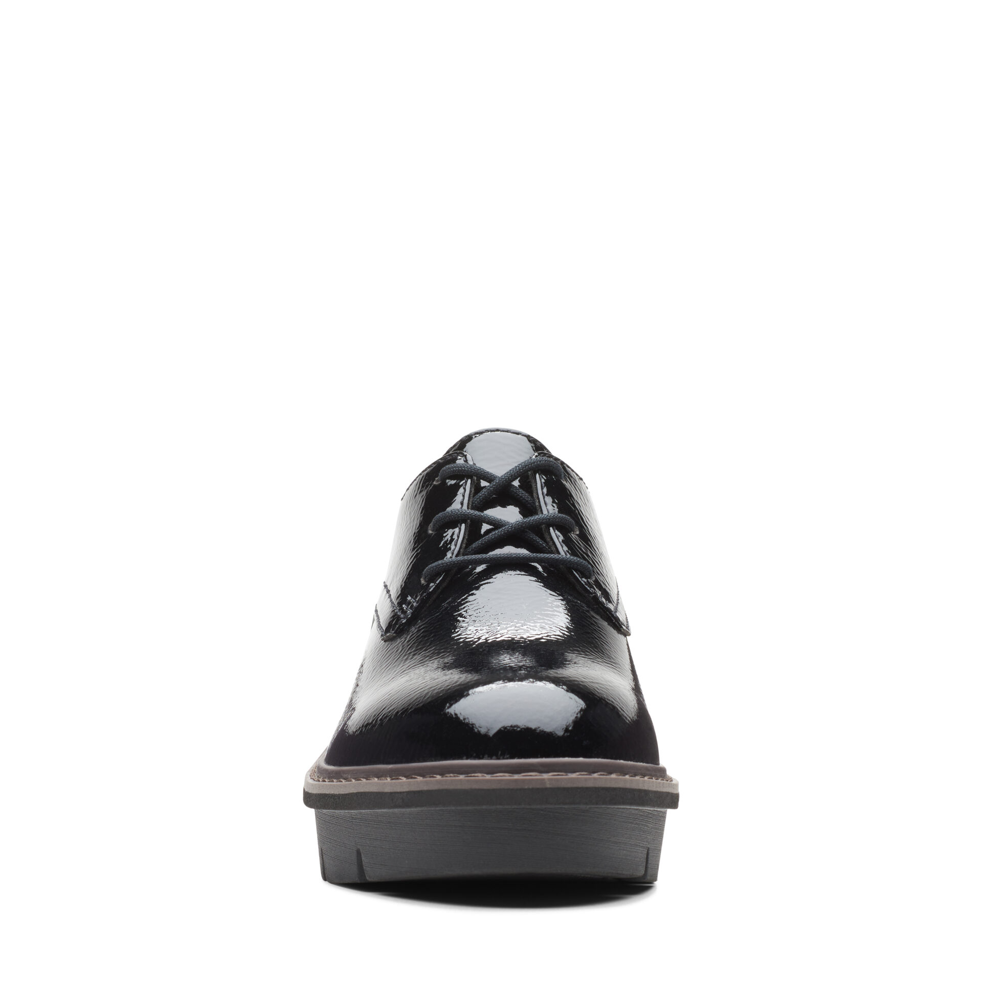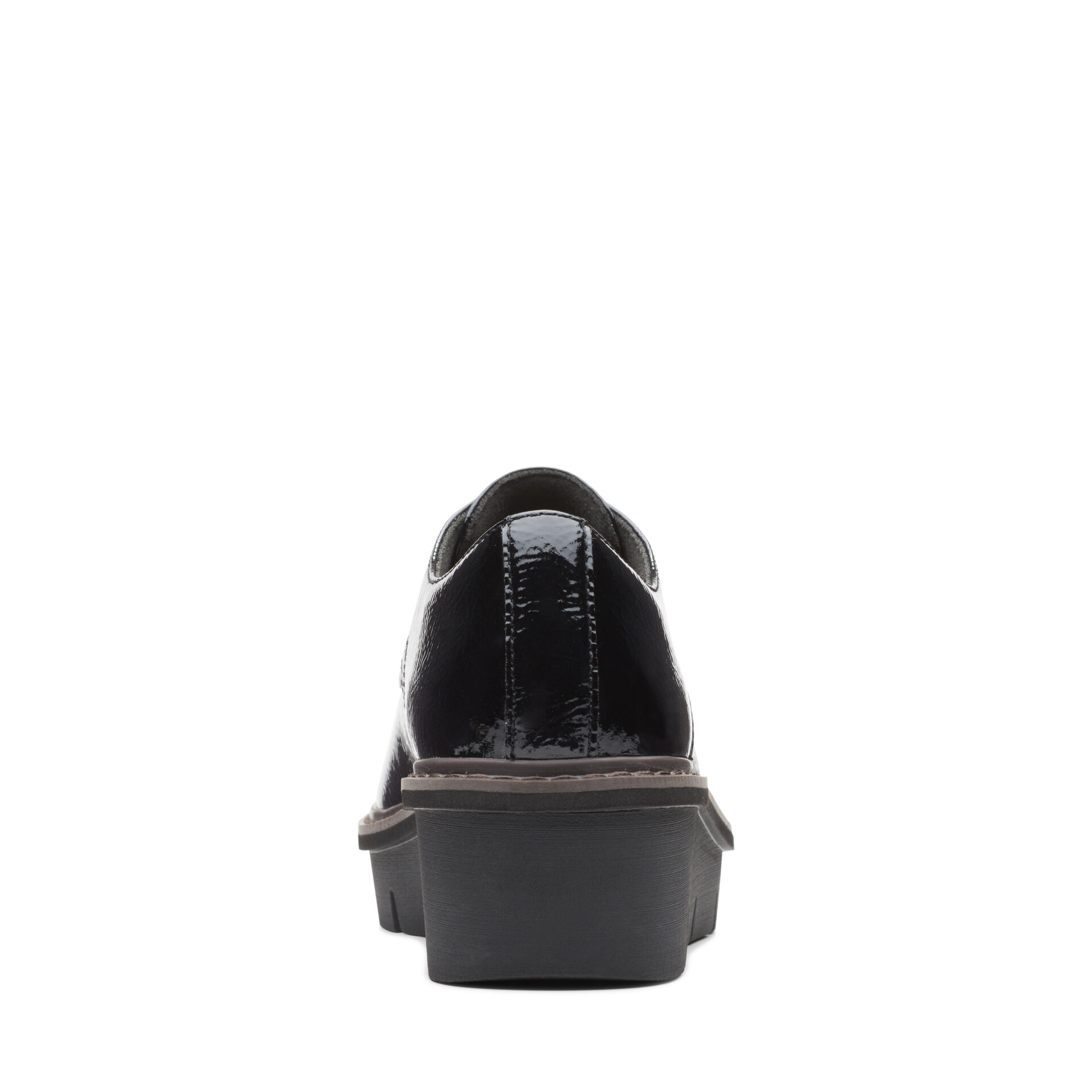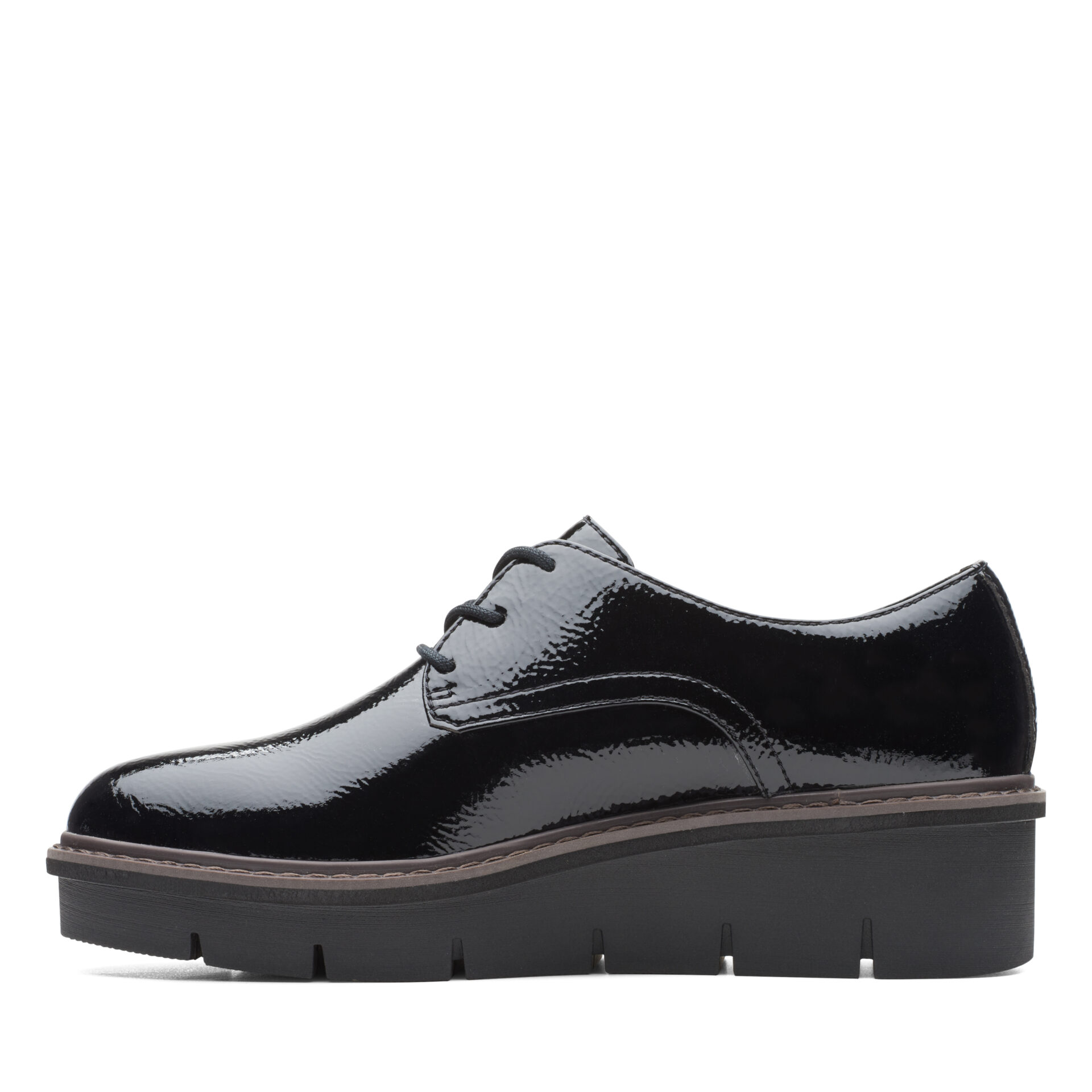 Дамски обувки от английската марка Clarks. Външната част е изработена от висококачествена, еко кожа покрита с лак. Вътрешната част е изработена от антибактериални, текстилни материали. Пристягат се лесно с връзки. Височината на ходилото в задната част е 3см – полезна и удобна височина. Стилен и удобен модел със анатомично оформена стелка.