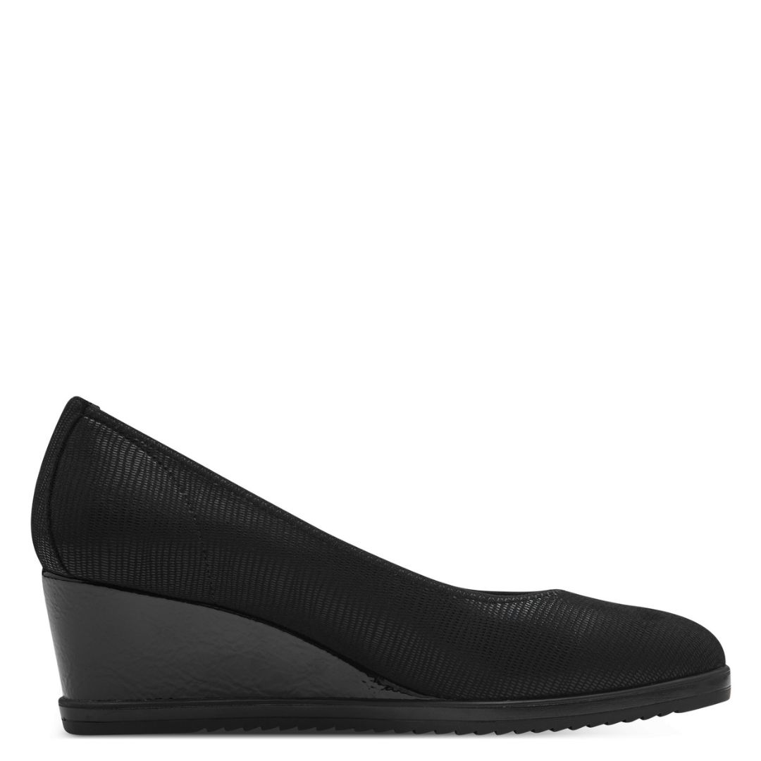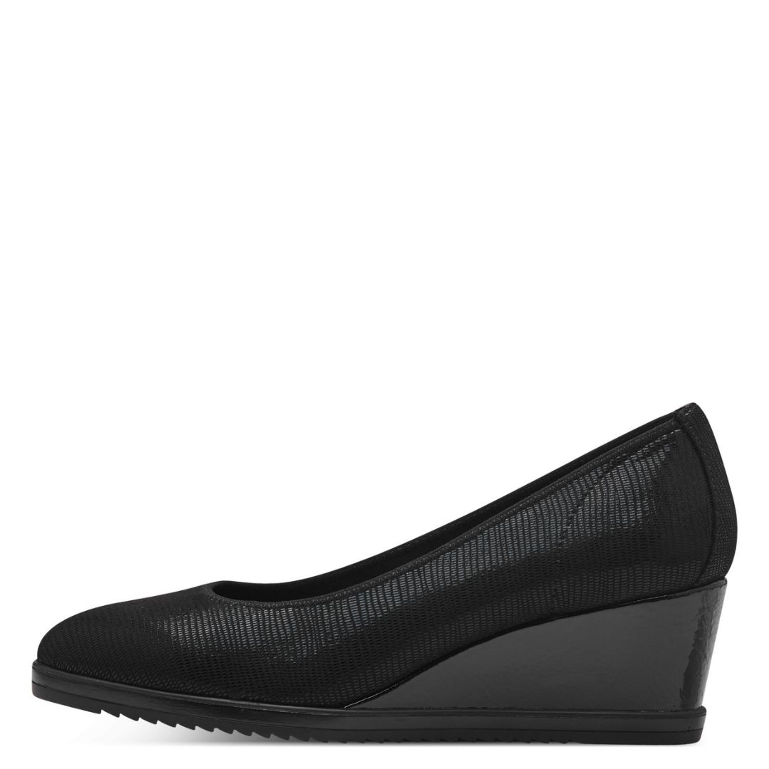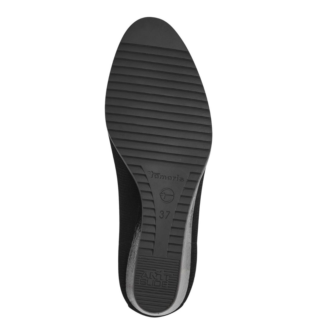 Дамски обувки от немската марка Tamaris. Външната част е изработена от текстил. Вътрешната част е от еко-коца и антибактериални текстилни материали . Технологията за изработка на стелката ви гарантира оптимален комфорт на ходилото. Височината на тока е 6 см.