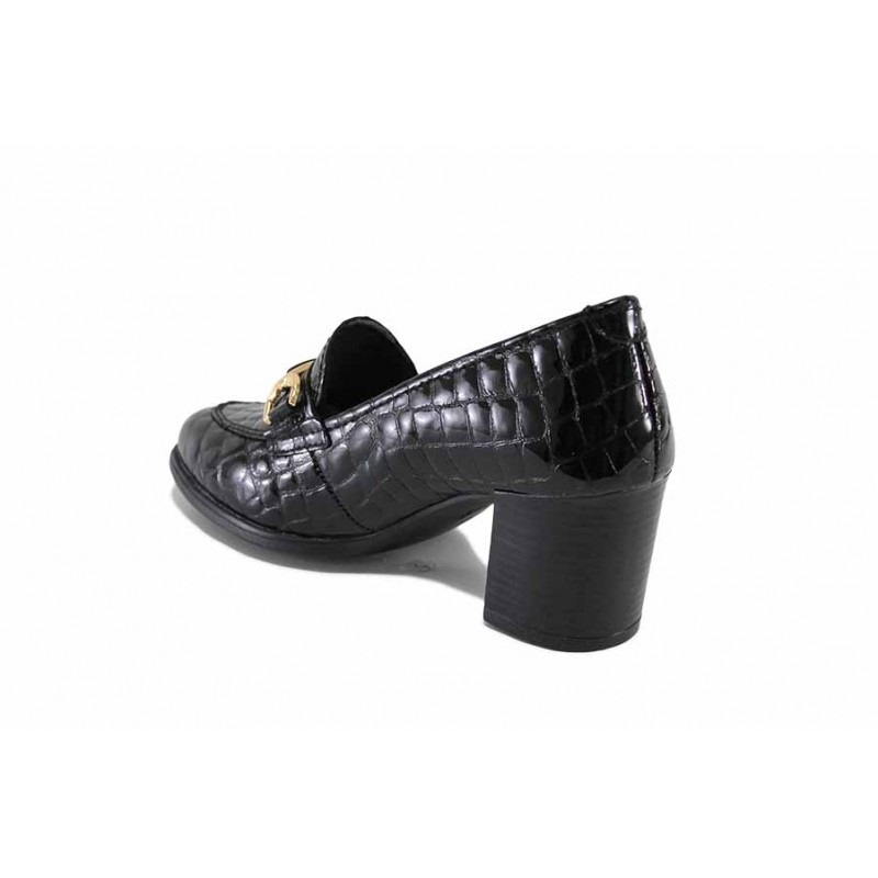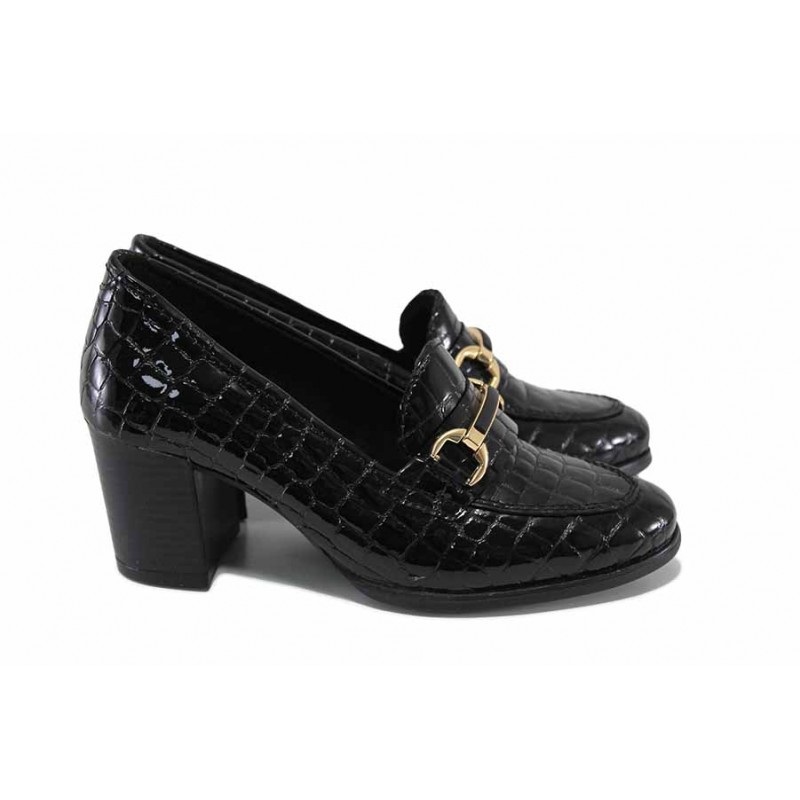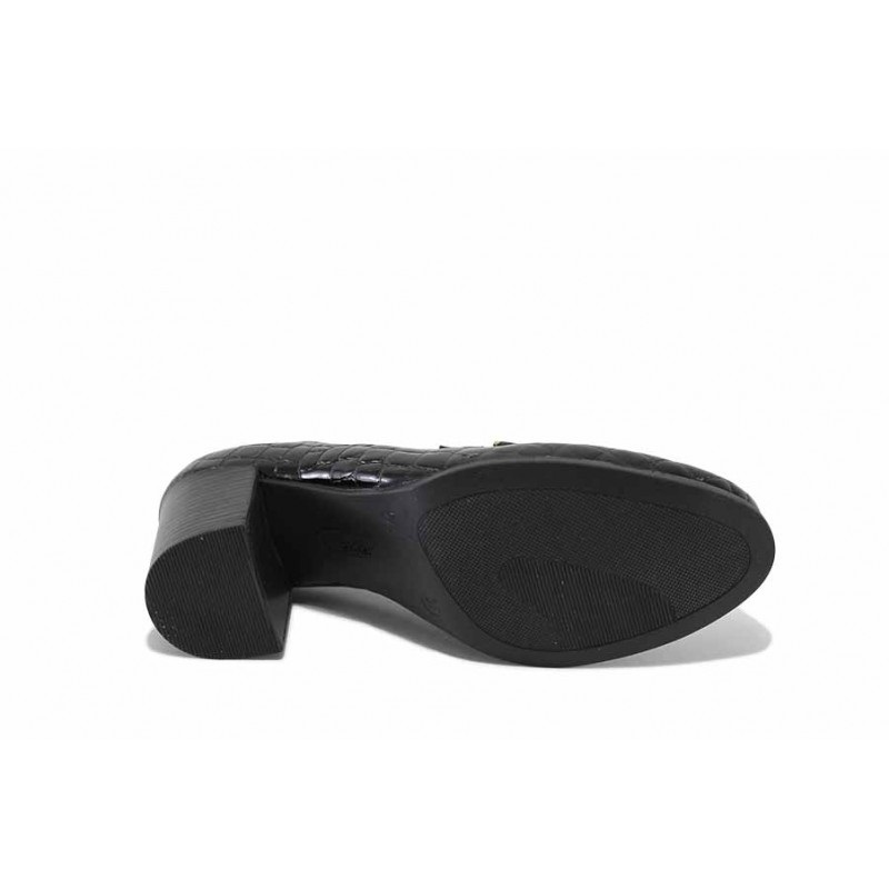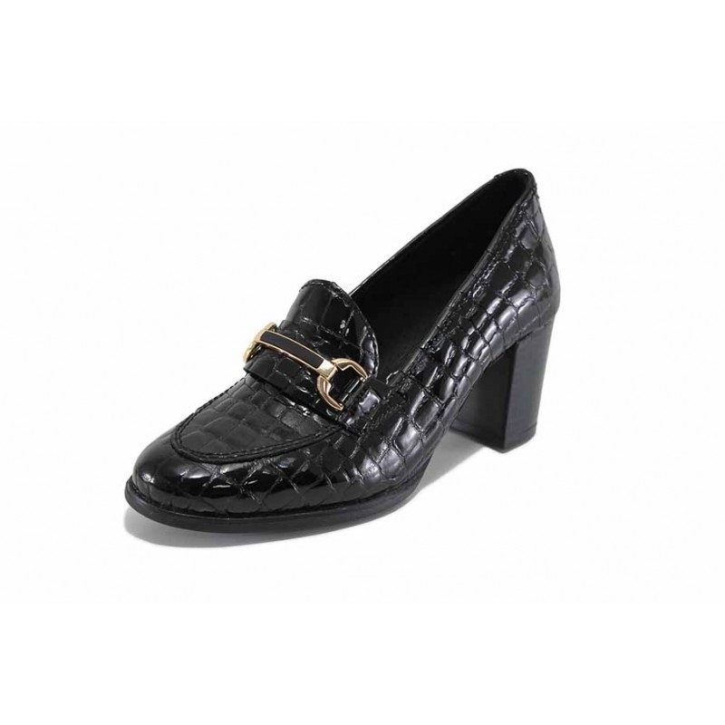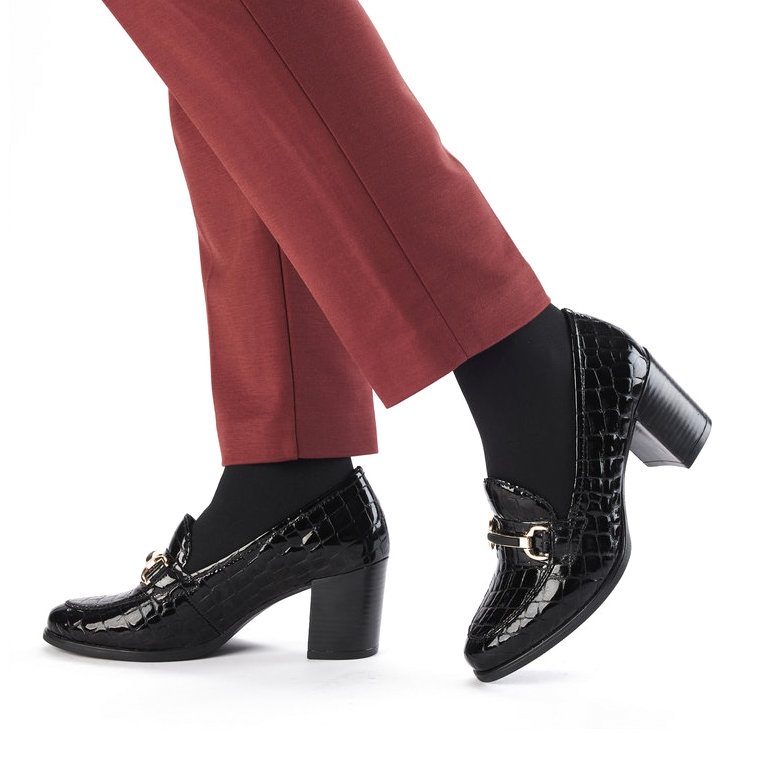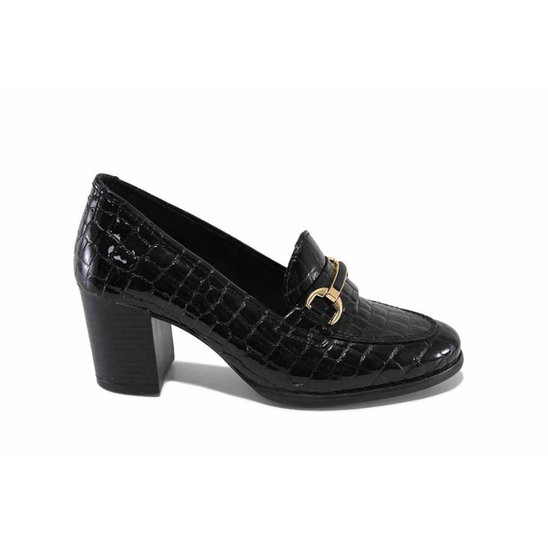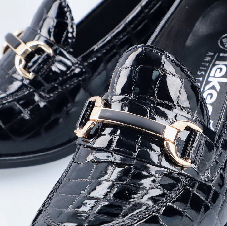 Дамски обувки на немската, комфорт марка Rieker. Лицевата част е изработена от естествена кожа покрита с лак. Хастара се състои от естествена кожа и антибактериални, текстилни материали.