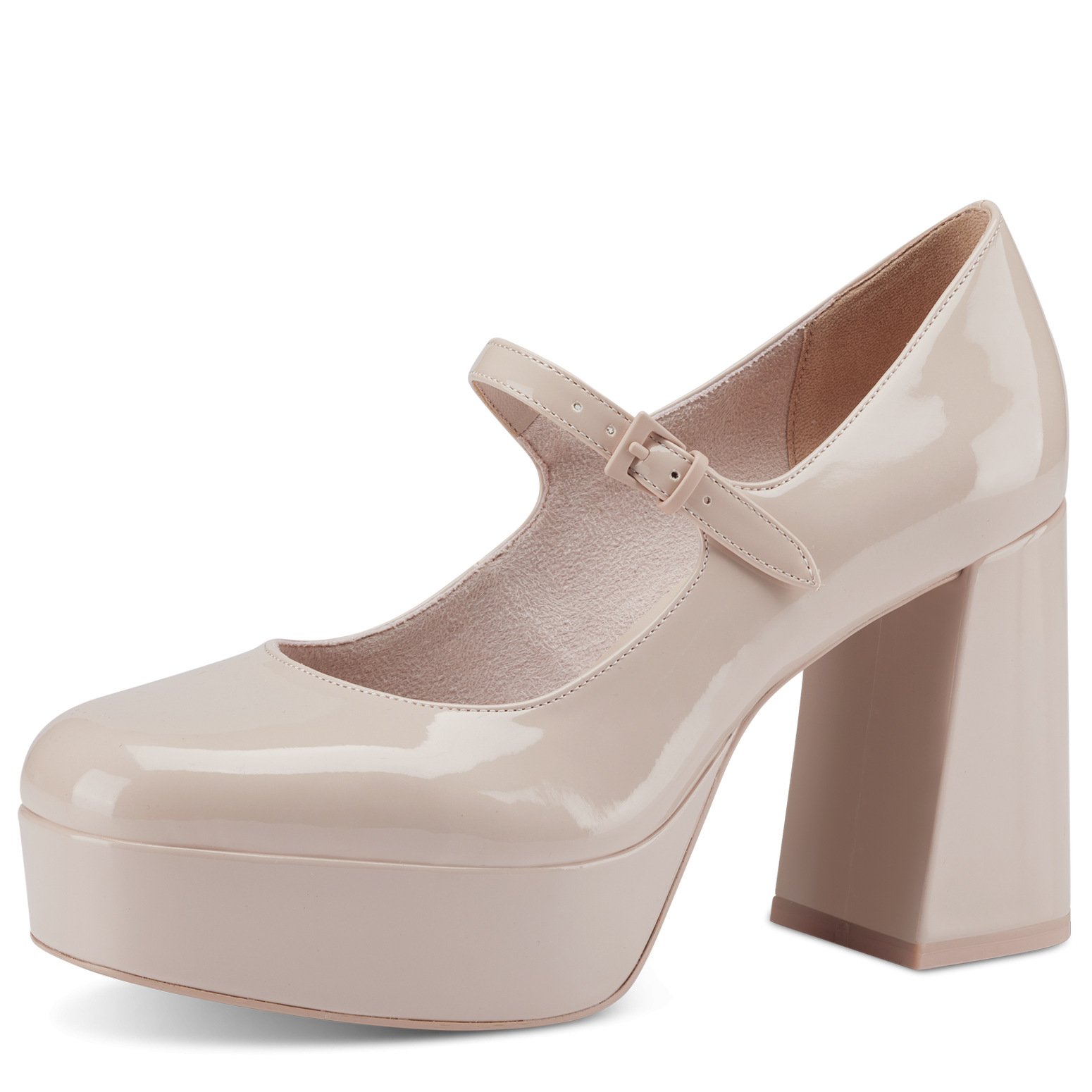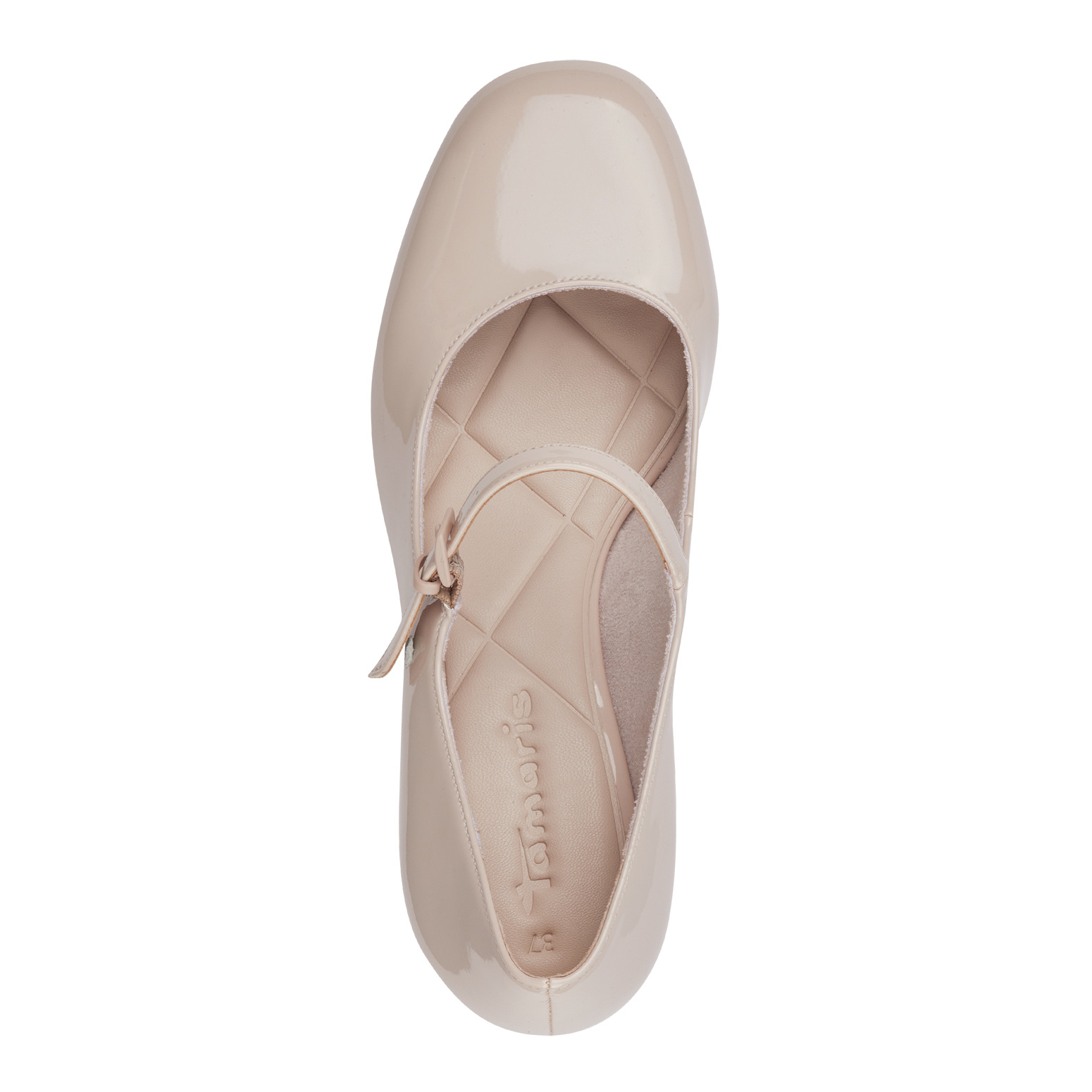 Външната част е изработена от синтетични материали покрити с лак. Вътрешната е комбинация от антибактериален текстил и изкуствена кожа. Технологията за изработка на стелката ви гарантира оптимален комфорт на ходилото. Височината на тока е 9.5 см.