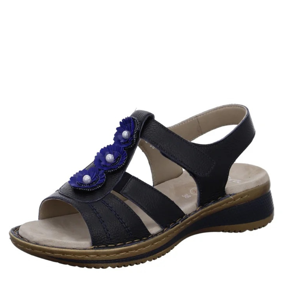 Дамски сандали от австрийската марка Ara. Външната и вътрешната част са изработени от висококачествена, естествена кожа. Височината на платформата в задната част е 3см – удобна и полезна височина. Обуват се лесно и са подходящи и за по-високи сводове. Мека стелка и лека подметка са гаранция за оптимален комфорт.