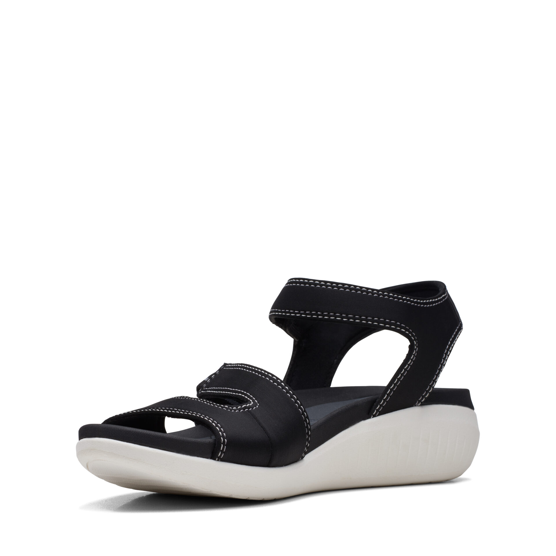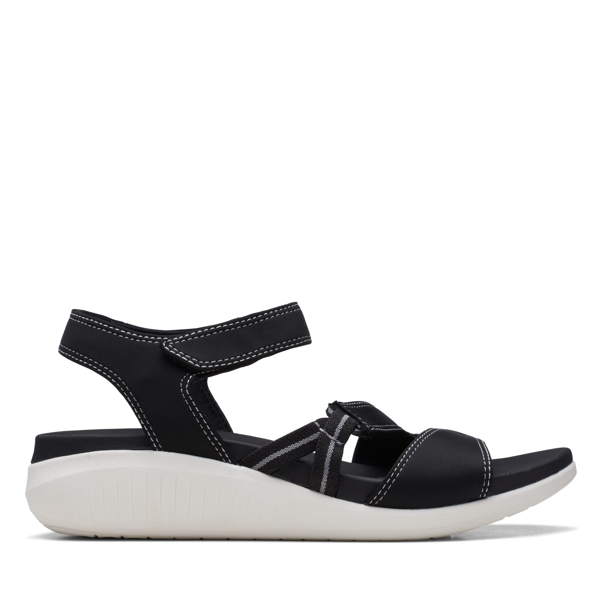 Дамски сандали от английската марка Clarks. Изработени са от висококачествени, текстилни и синтетични материали. Модел от Cloudsteppers серията на марката. Cloudsteppers са известни с неповторимия си комфорт на достъпни цени. Дебелината на платформата в задната част е 4 см – полезна и удобна височина.