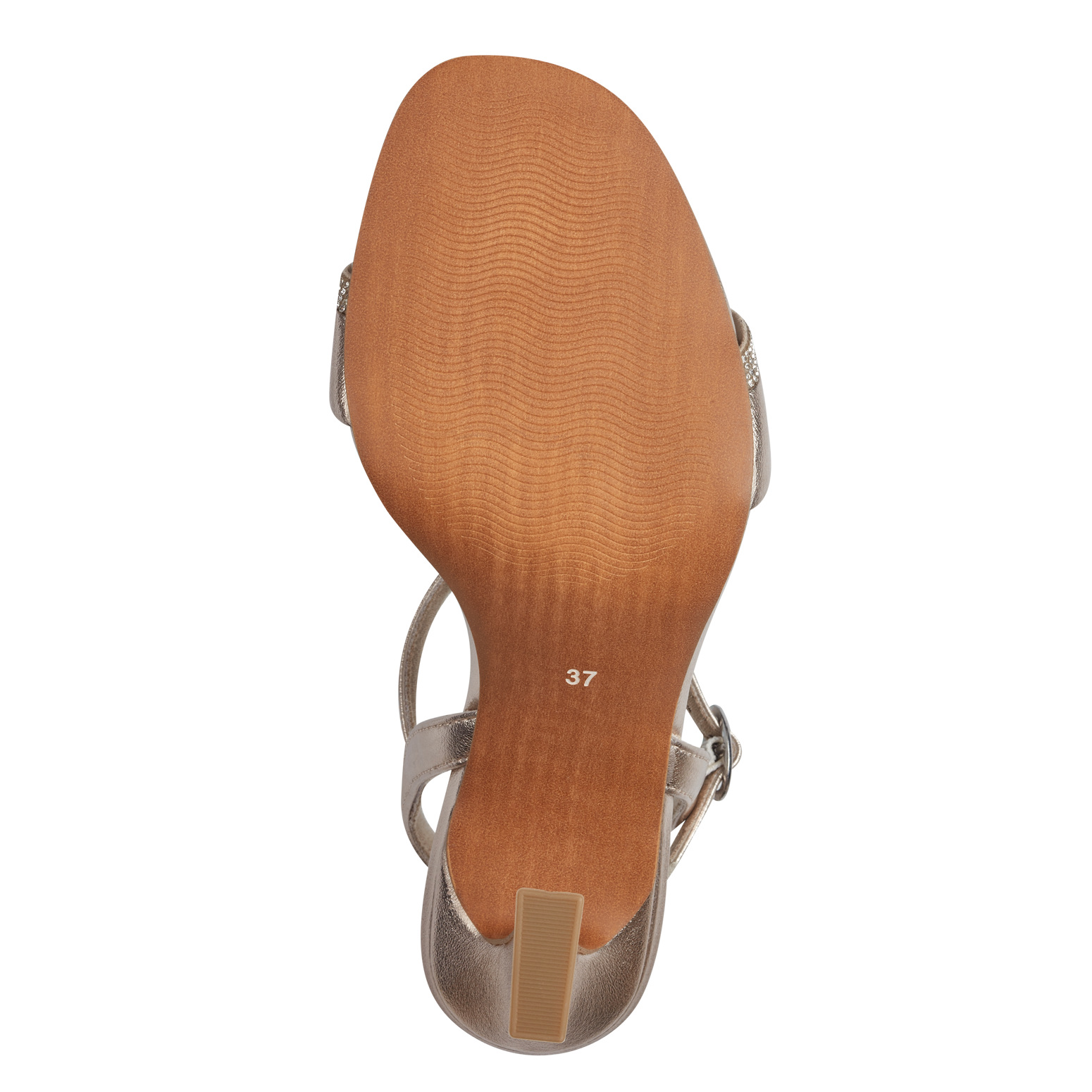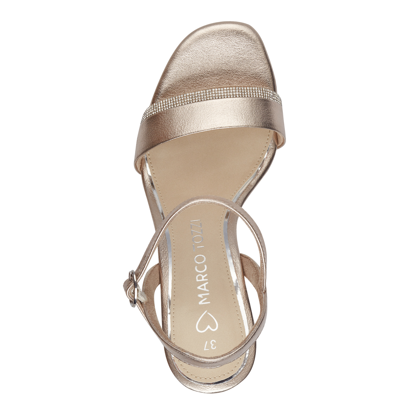Дамски сандали от немската марка Marco Tozzi. Външната част и вътрешната част са комбинация от изкуствена кожа и текстилни материали. Височината на тока в задната част е 9см. Подметката е лека и с изключителни качества на еластичност.
