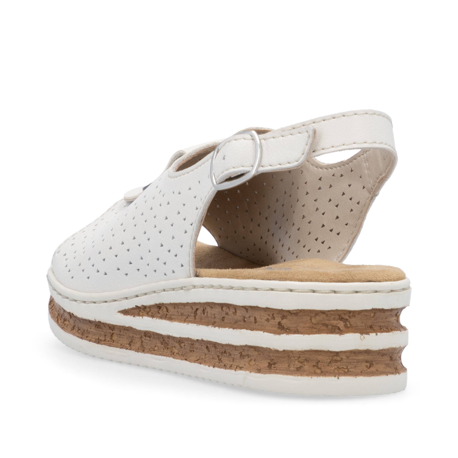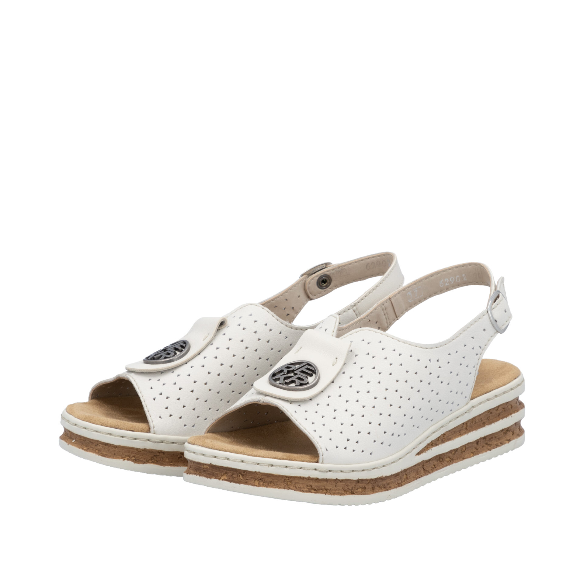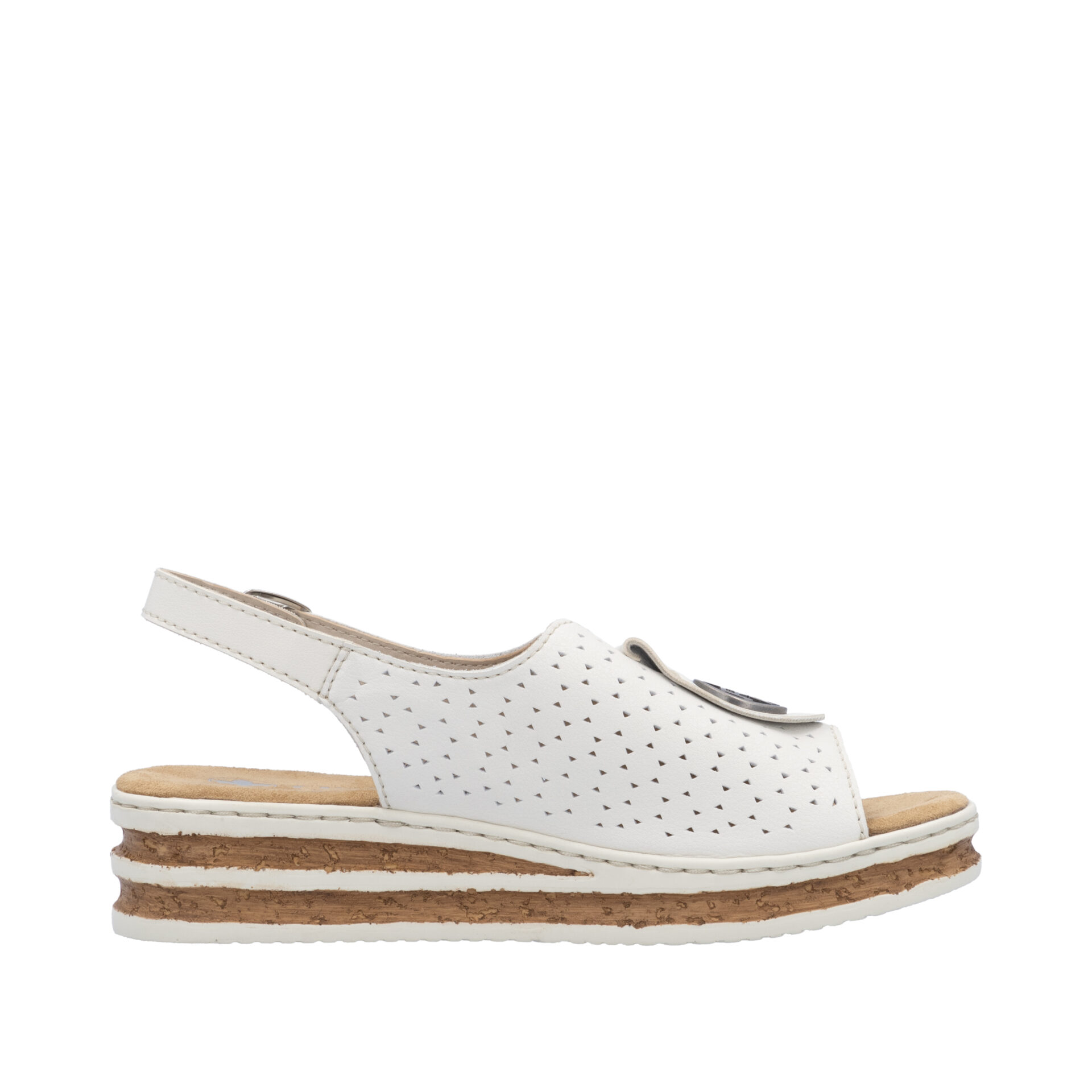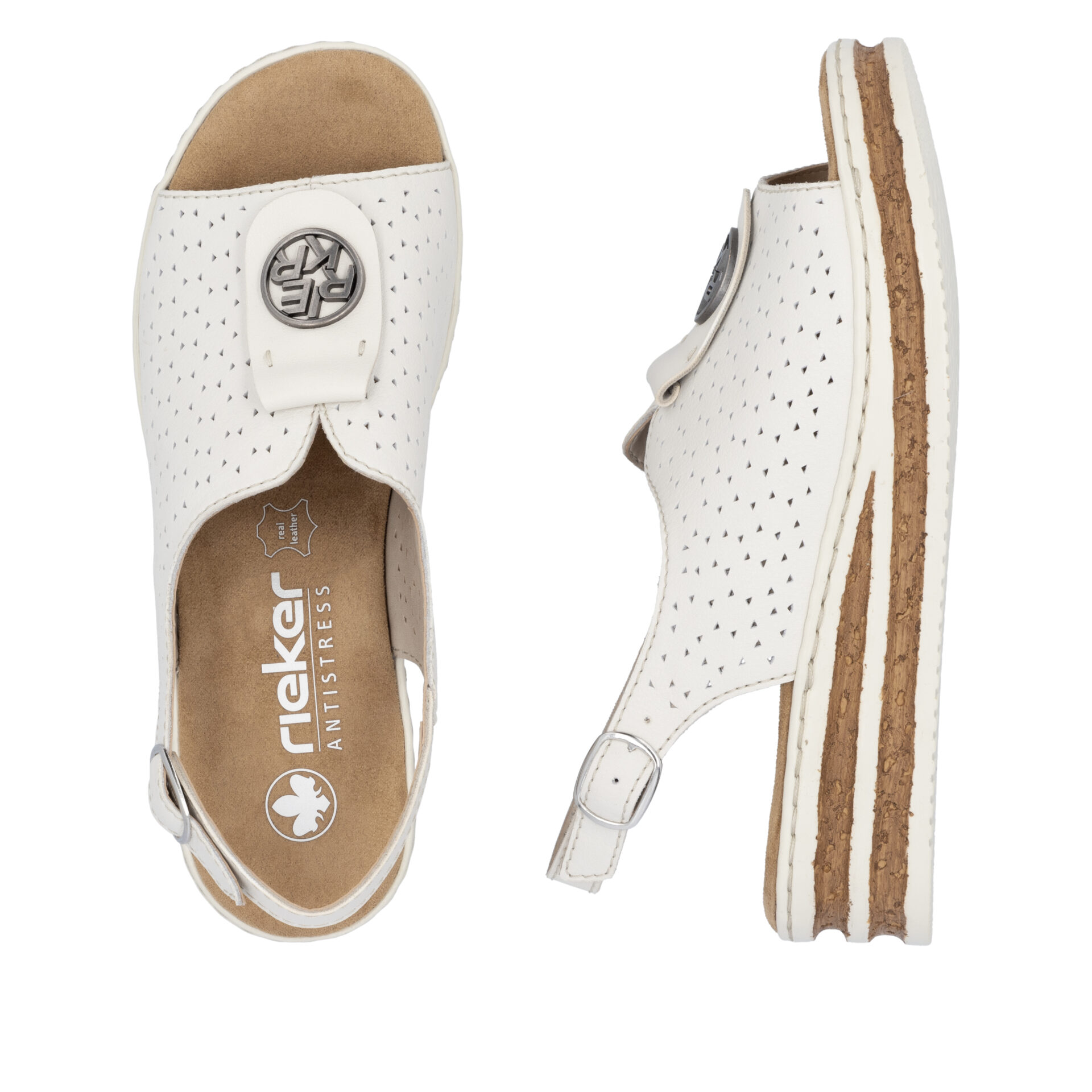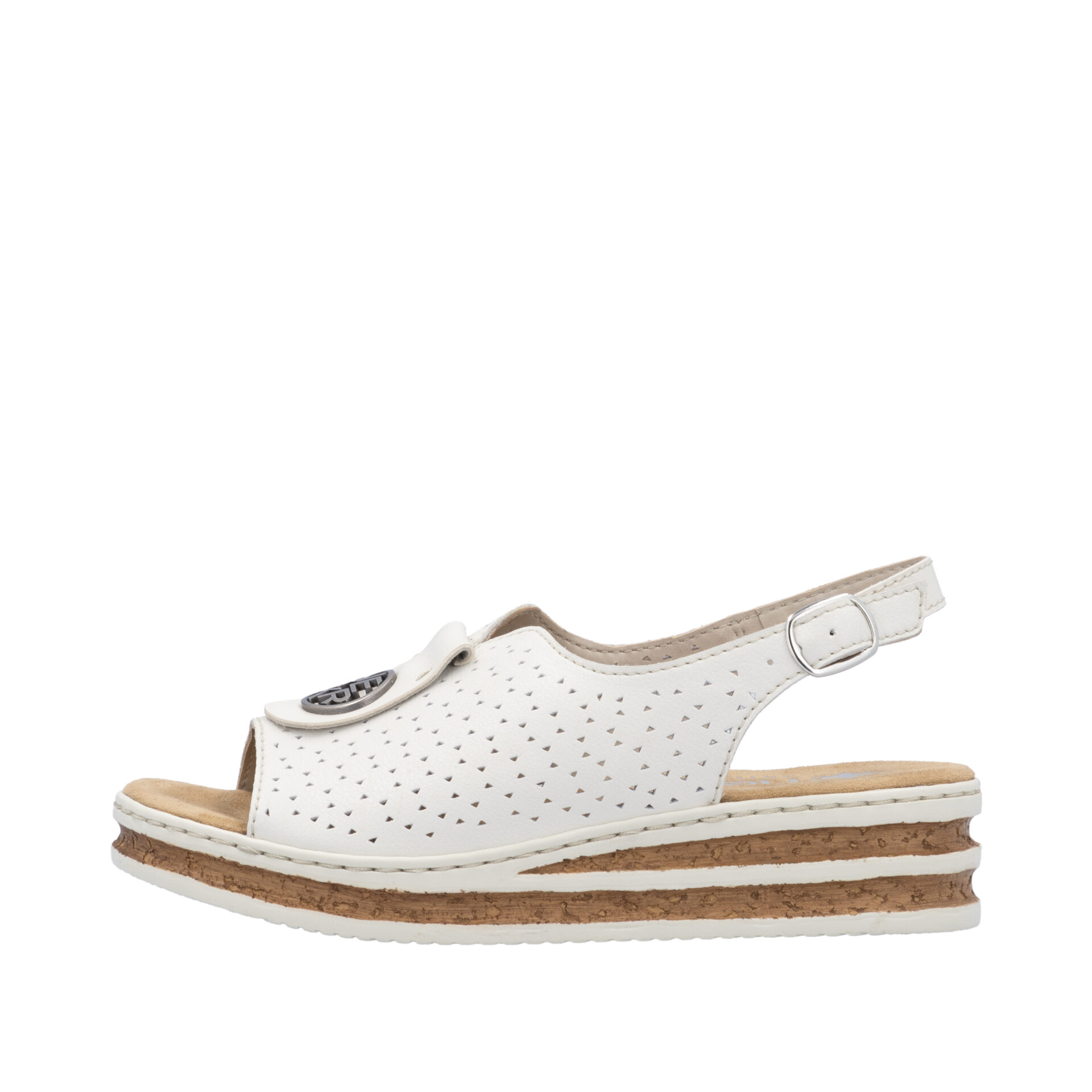 Дамски сандали от световноизвестната, комфорт марка Rieker. Външната част е комбинация от естествена кожа и еко-кожа. Вътрешната част е изработена от еко-кожа и текстилни материали, които предпазват стъпалата Ви от алергии и изпотяване. Дебелината на подметката в задната част е 4 см. ANTISTRESS подметката намалява напрежението в гръбнака, ставите и междупрешленните дискове.