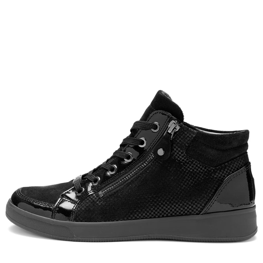 Този стилен модел на Ara е изработен от висококачествен естествен велур в комбинация с лакови елементи, които придават изискан и модерен акцент. Черният цвят подчертава универсалността на обувката и я прави подходяща както за ежедневието, така и за по-елегантни визии.