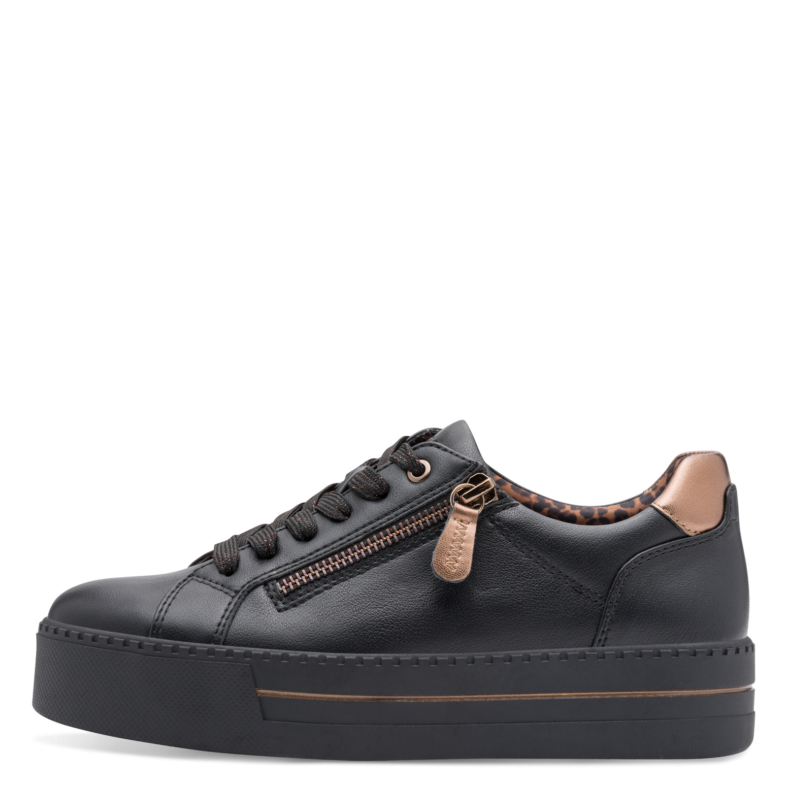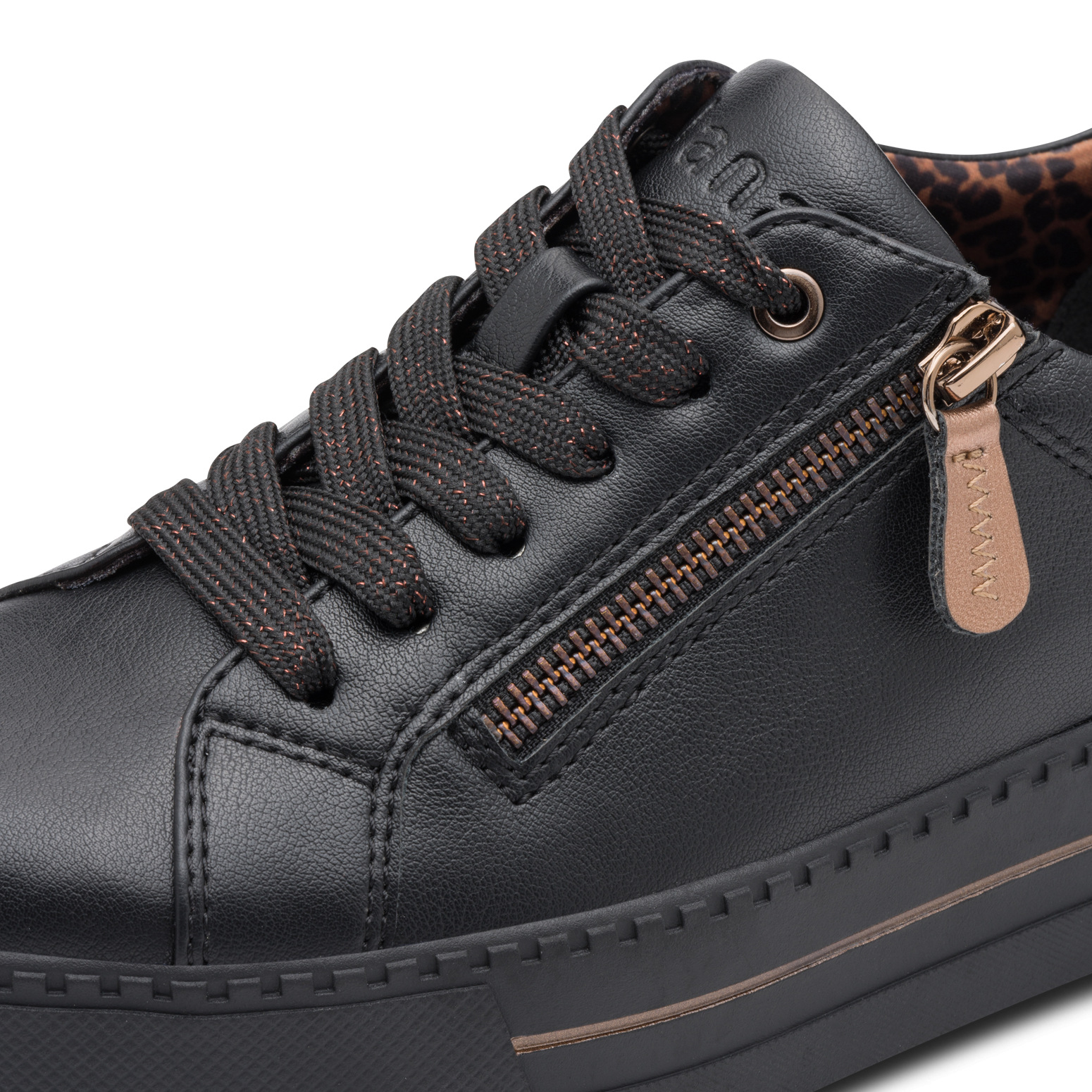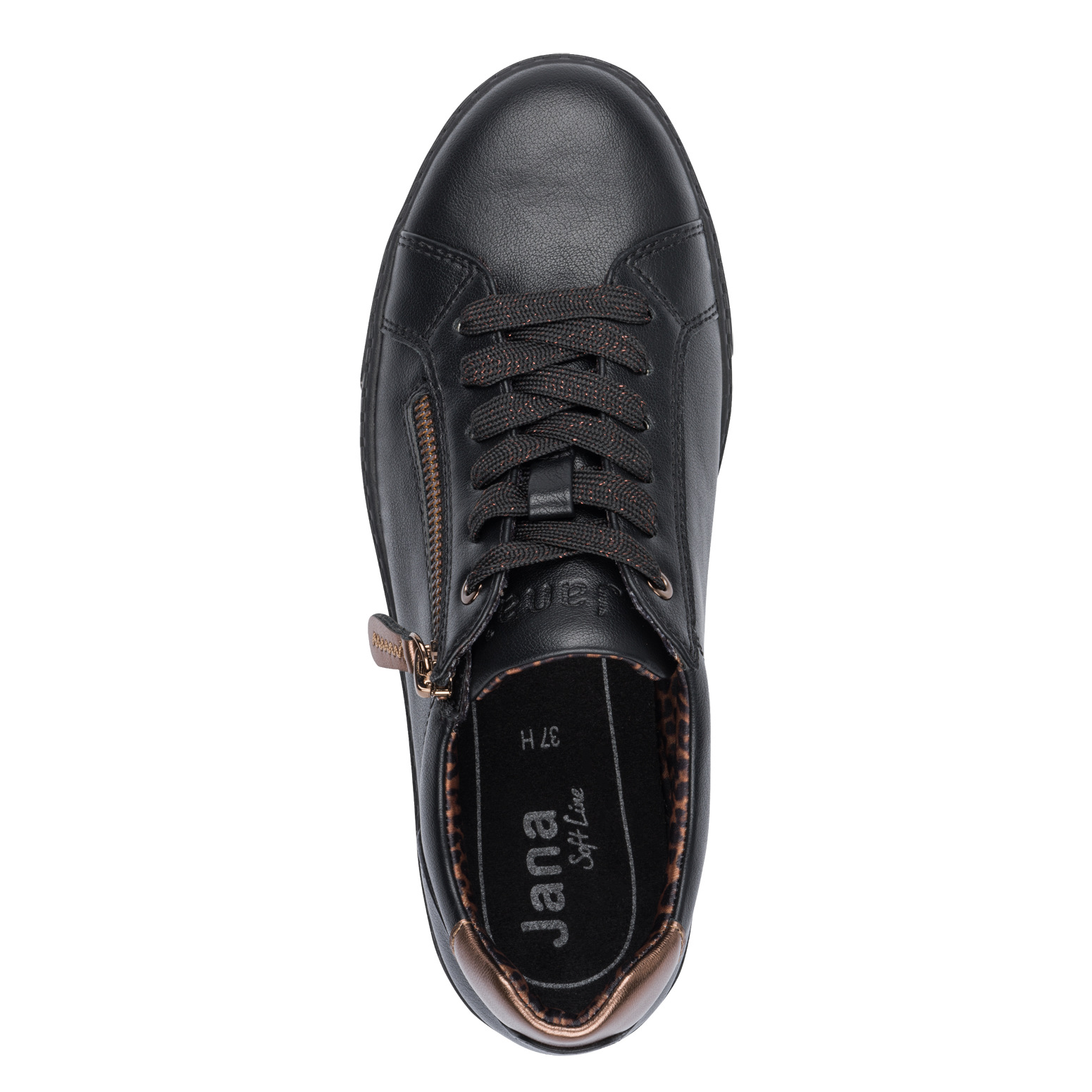 Дамски спортни обувки Jana – Стилни и модерни кецове в черен цвят с фини медни акценти, които придават елегантен вид. Изработени от висококачествена еко кожа, с мека вътрешна подплата и комфортна стелка Jana Soft line за приятно усещане през целия ден. Моделът е реализиран в ширина H – подходящи за по-широки ходила.