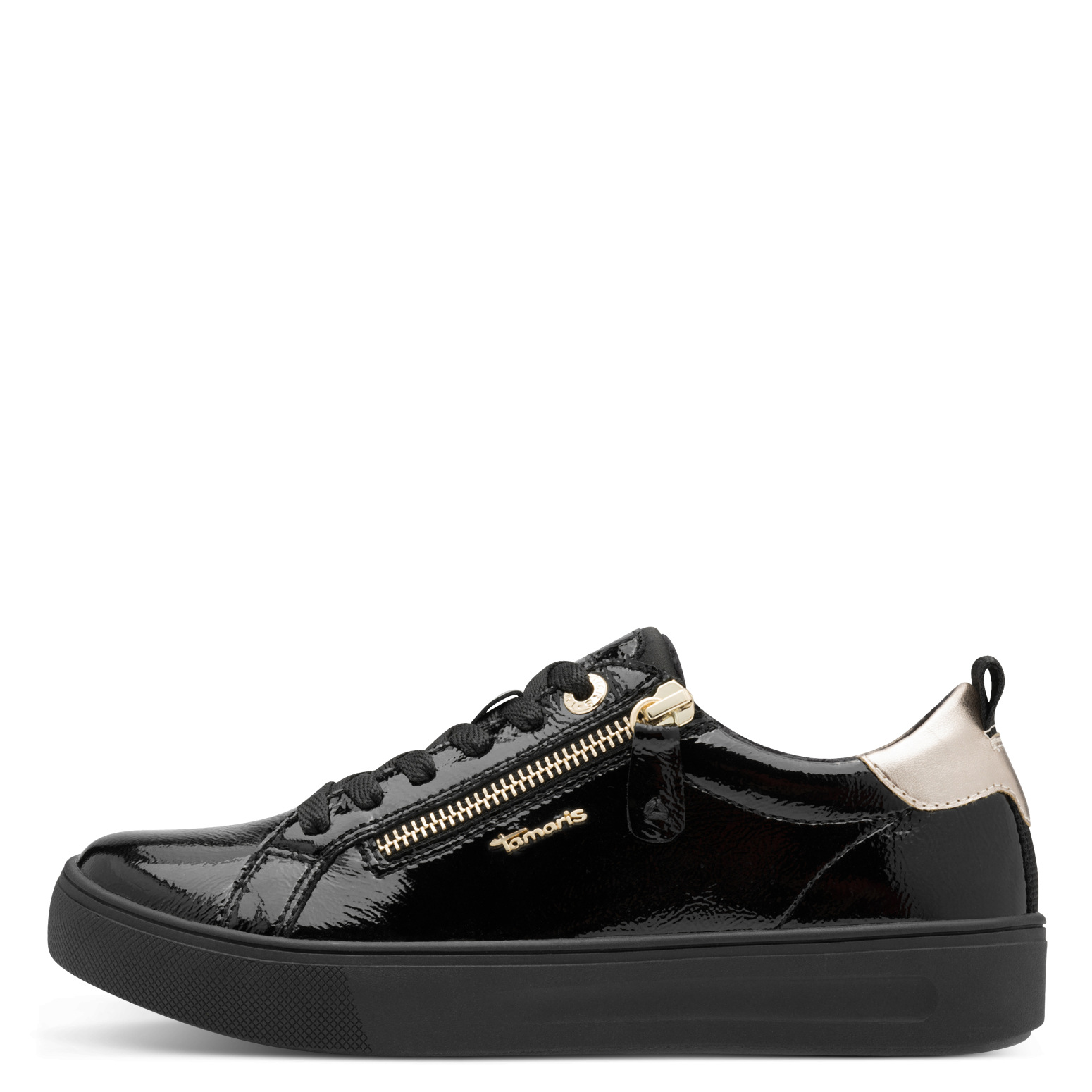 ✔ Дизайн: Черен лак с модерни акценти в златисто и декоративен страничен цип за по-удобно обуване.