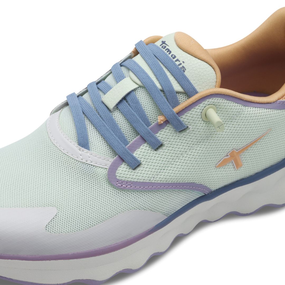 Дамски маратонки от немската марка Tamaris. Изработени от еко-кожа и текстил. Вътрешната част се състои от антибактериален текстил, който предпазва ходилата от алергии и изпотяване. Стелките са с мемори пяна.Обуването става лесно чрез ластични връзки. Височината на подметката в задната част е 3см.