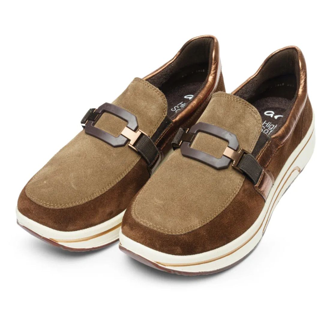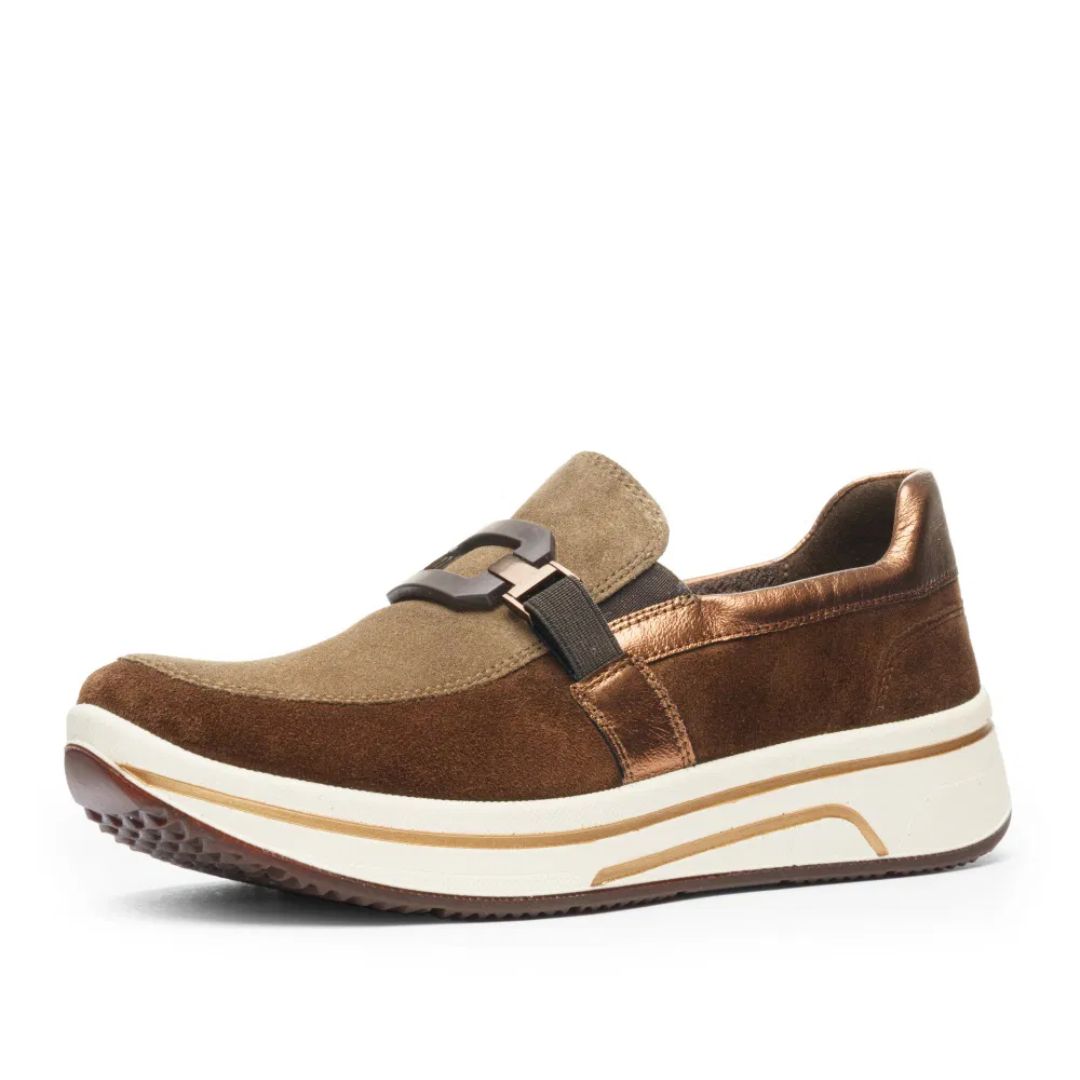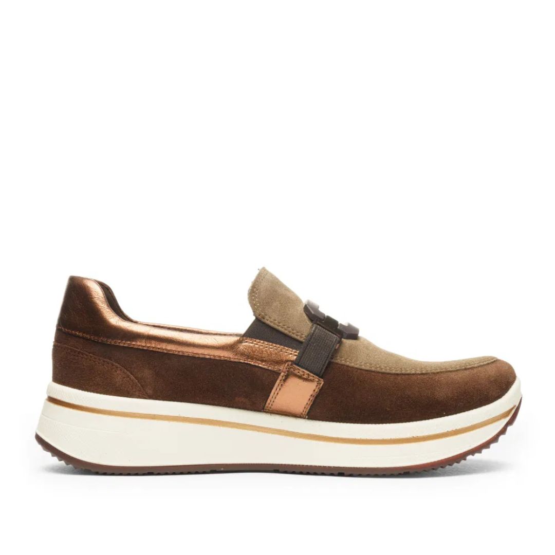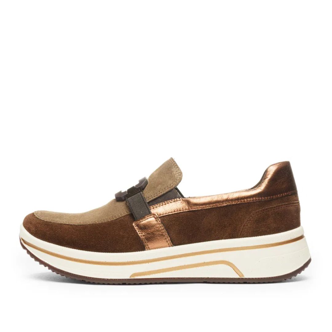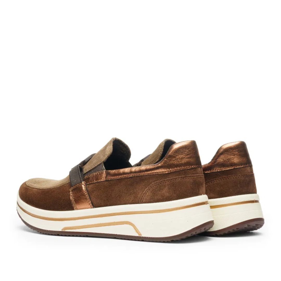 Обувките от Ara са изработени от висококачествен естествен велур в топли кафяви нюанси, комбинирани с металически акценти, които придават модерен и изискан вид. Универсалният дизайн ги прави подходящи както за ежедневие, така и за по-стилни визии.