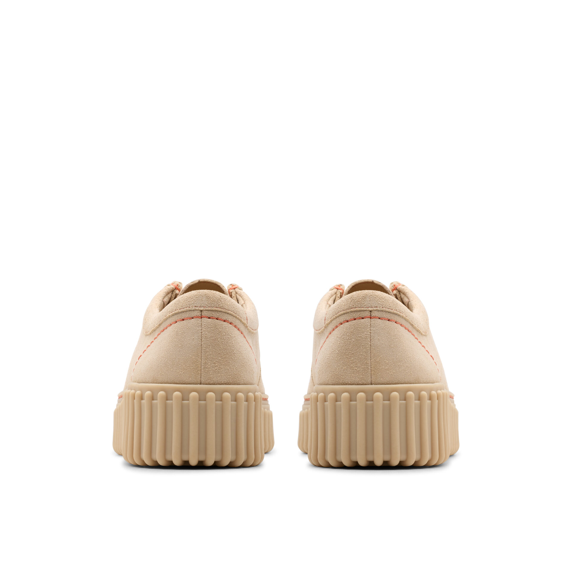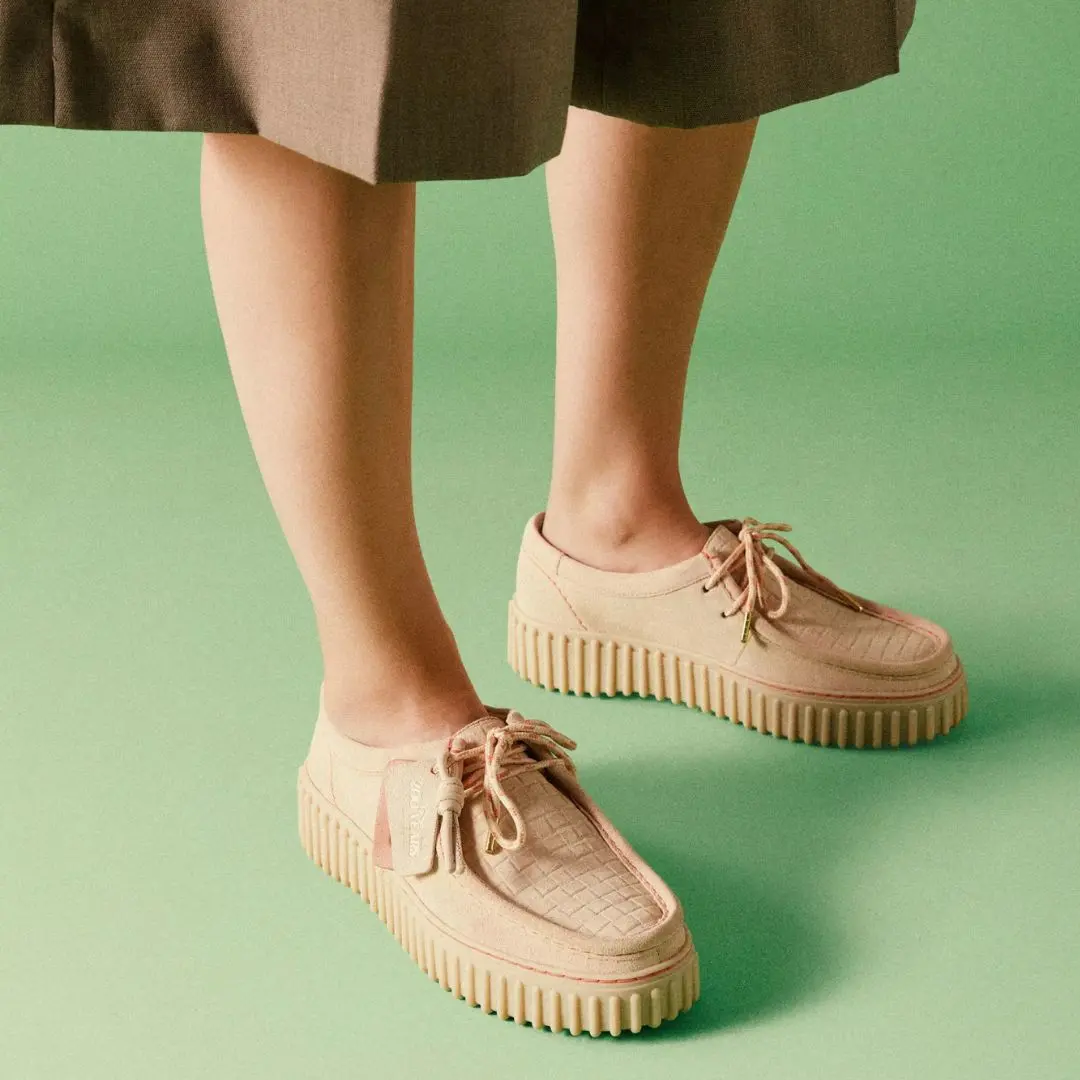 Дамски обувки от марката Clarks. Моделът  е със съвременна и изразителна визия. Обувките са изработени от светъл бежов велур, като горната част включва релефна текстура с квадратен мотив, придаваща модерен акцент. Имат връзки с декоративни шевове в оранжево и характерен език с брандирана кожен етикет.