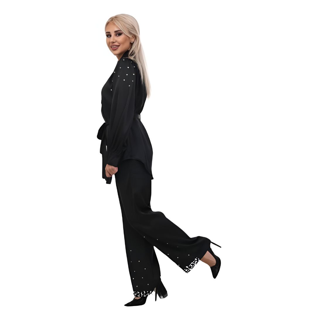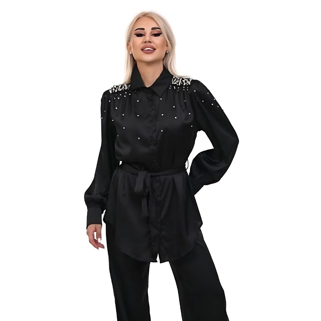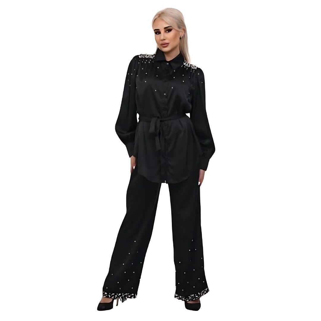 Елегантният черен костюм е перфектен избор за изискани събития, когато искате да изглеждате впечатляващо, без да жертвате комфорта. Съчетанието на висококачествен сатен и деликатни перли придава на тоалета невероятна мекота и блясък, създавайки незабравим стил. Ризата с дълги ръкави и елегантни маншети осигурява класическа визия, докато перлите върху нея и панталоните добавят щрихи на лукс и женственост. Панталоните с висока талия и леко разширени крачоли оформят изящен силует и гарантират удобство през целия ден.