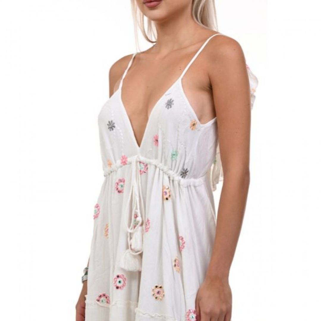 Тази изящна плажна рокля е изработена от висококачествена, дишаща материя, която гарантира прохлада и комфорт дори при най-горещото време. Нейната ефирна и свободна кройка ви позволява да се движите с лекота, подчертавайки женствените линии на тялото ви.