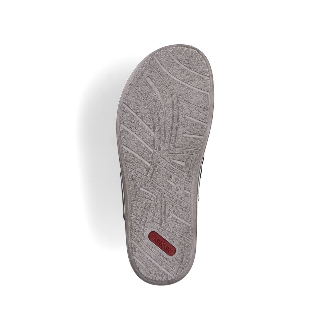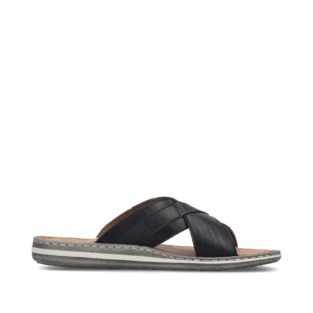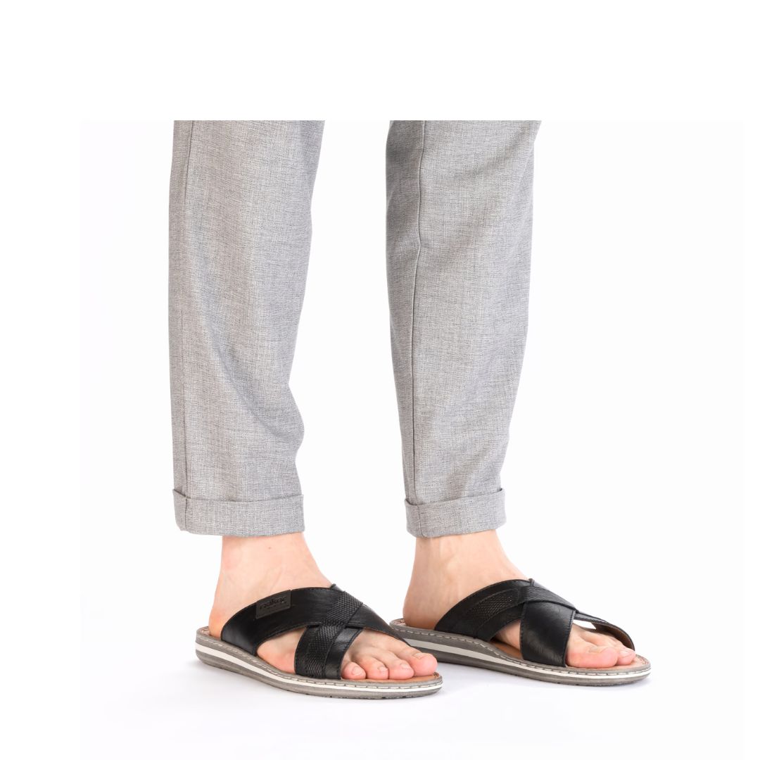 Мъжки чехли произведени от световноизвестната немска фирма Rieker. Изработени са естествена кожа и еко-кожа. Дебелината на подметката е 2.5 см. Ръчно шити за допълнителен комфорт. Ходилото ANTISTRESS намалява напрежението в гръбнака, кръстта и ставите. С тези чехли Вие получавате модерна визия и незаменим комфорт. Ударопоглъщащата и лека подметка осигурява омекотено изживяване при бягане. Комфортната ширина G дава на краката ви повече пространство в обувката.