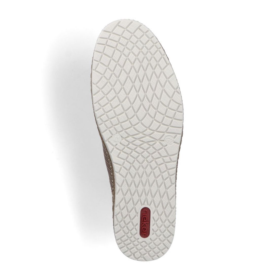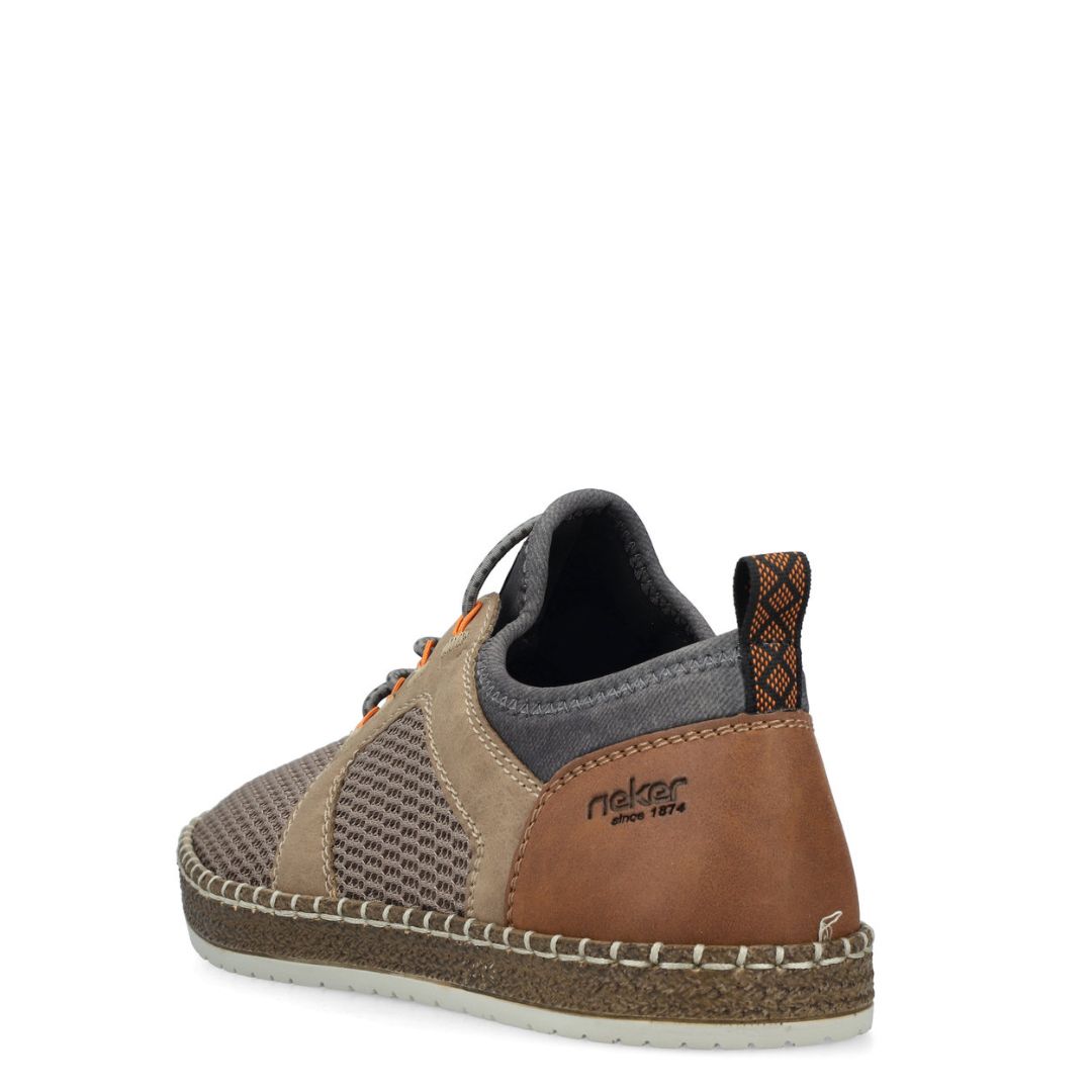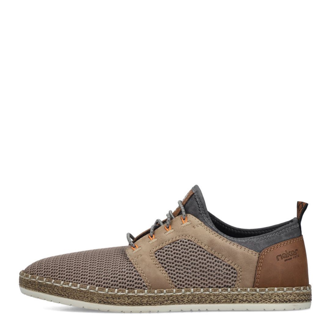 Мъжки летни обувки Rieker. Тези обувки са създадени за динамичното ежедневие, като комбинират изкуствена кожа и текстилни материали във външната си част, осигурявайки лекота и проветривост. Плетената конструкция придава допълнителна гъвкавост, което ги прави идеални за дълги разходки или активни дни.