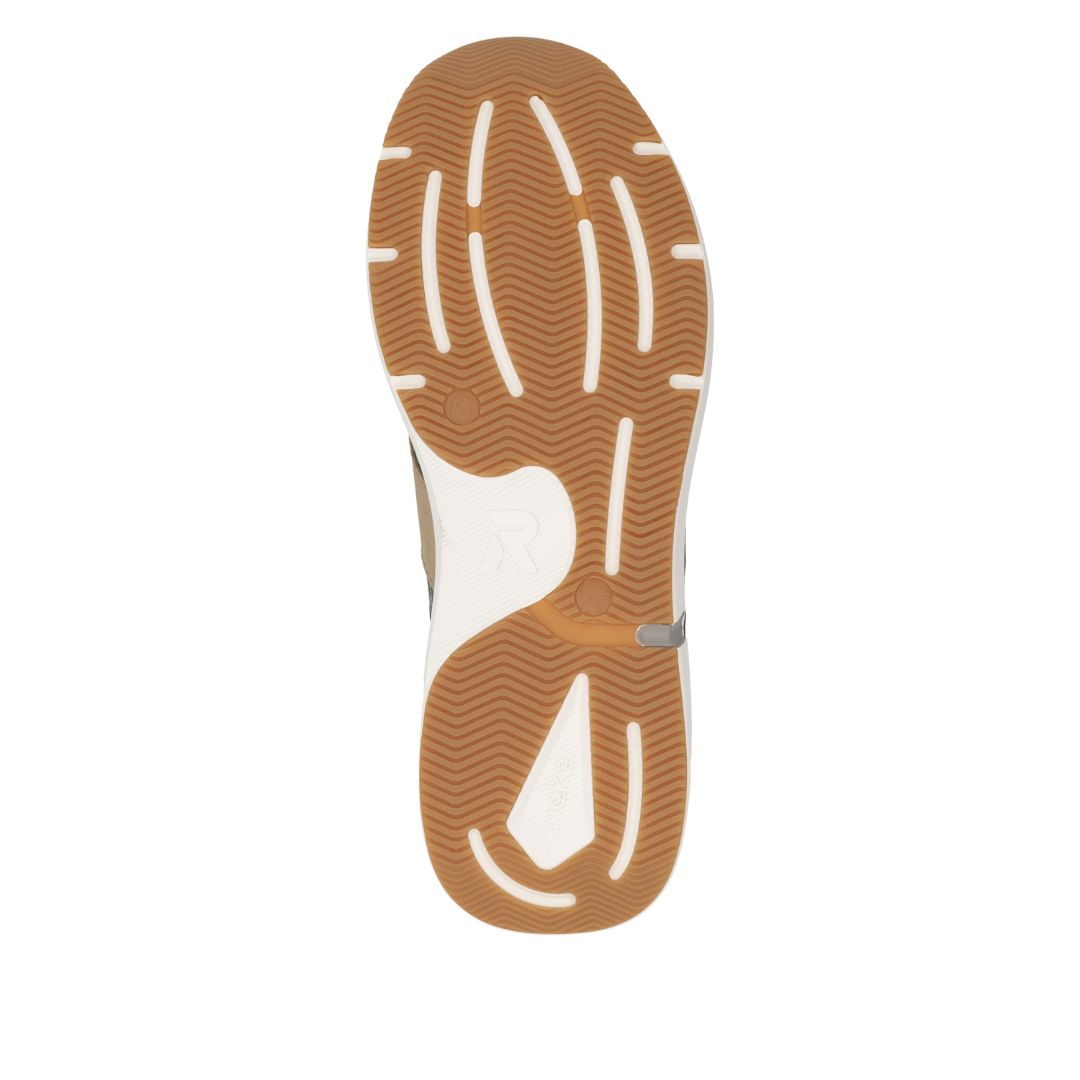 Мъжки маратонки от немската марка Rieker. Изработени от естествена кожа и текстил. Вътрешната част е покрита с антибактериален текстил, който предпазва ходилото от алергии и изпотяване. Стелките са с мемори пяна. Височината на подлетката в задната част е 4см. с иделана анатомична форма. За лесно обуване и нужда от пристягане се грижат връзките.