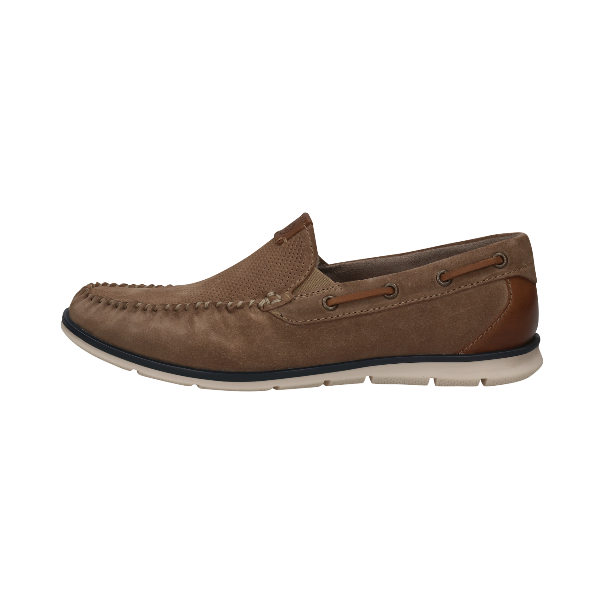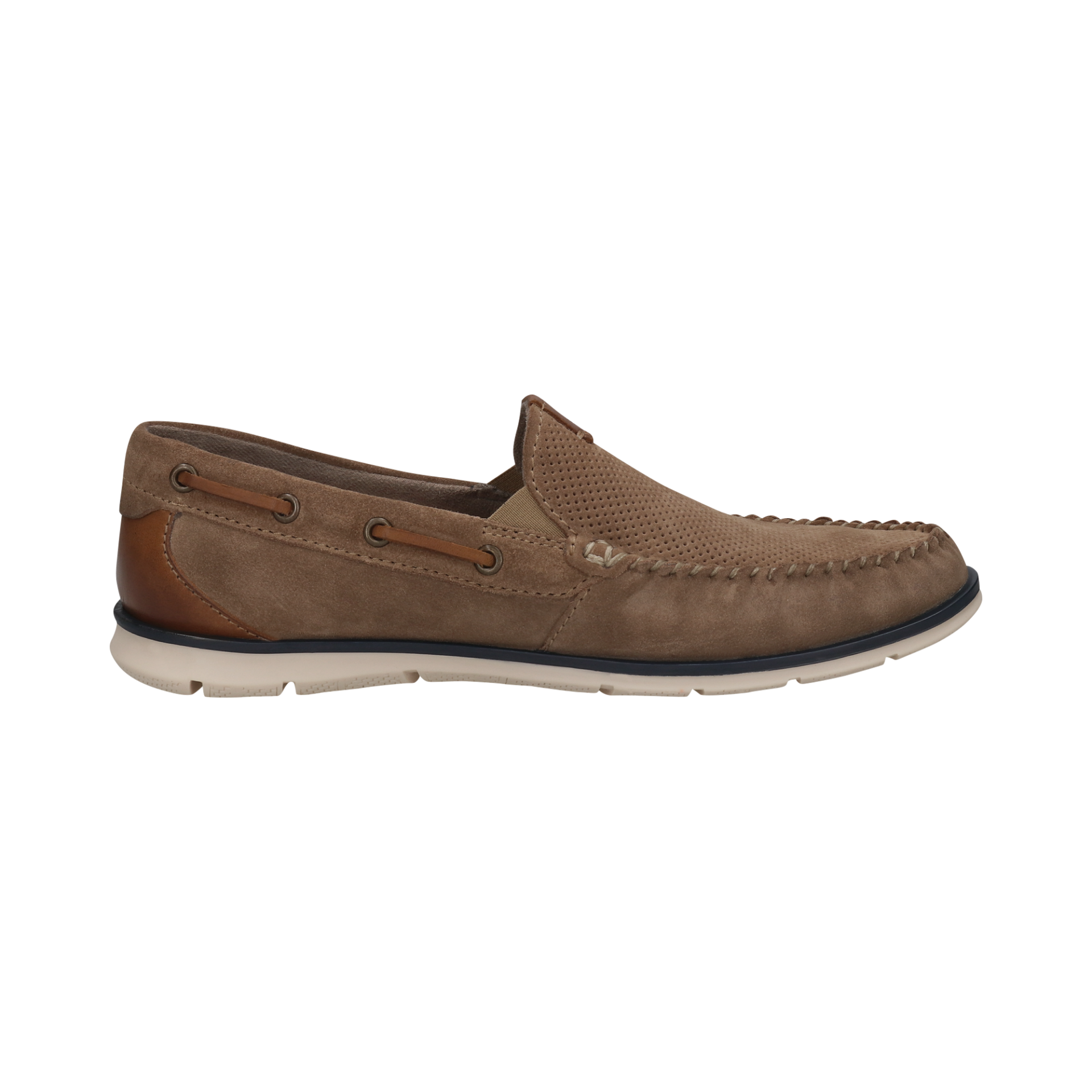 С мека вътрешна подплата и гъвкава бяла подметка с тъмносин кант, мокасините осигуряват отличен комфорт при ходене и са идеални както за ежедневието, така и за неформални поводи. Перфектният избор за модерния мъж, който цени удобството и класическия стил.