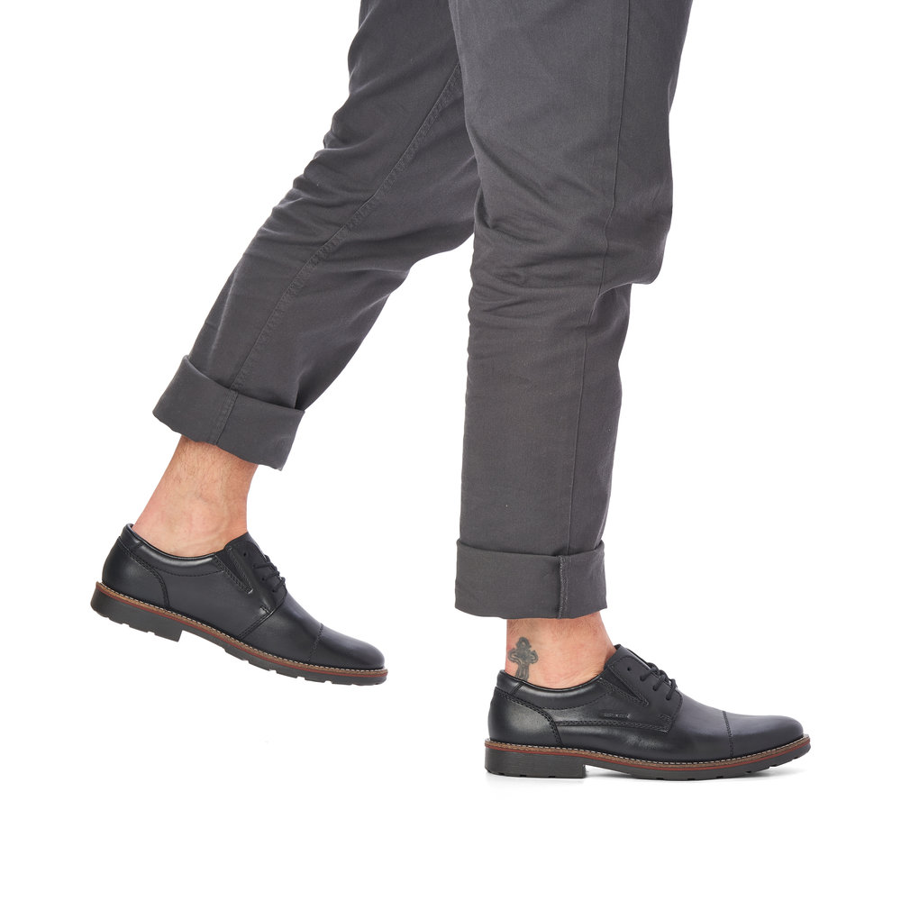 Мъжки обувки от известната комфорт марка Rieker. Изработени са от висококачествена, естествена кожа  в комбинация с изкуствена кожа. Височината на ходилото е стандартно – 2.5 см. Хастара е комбинация от естествена кожа и  еко-кожа. ANTISTRESS ходилото намалява напрежението в гръбнака, ставите и кръстта и Ви гарантира комфорт през целия ден.