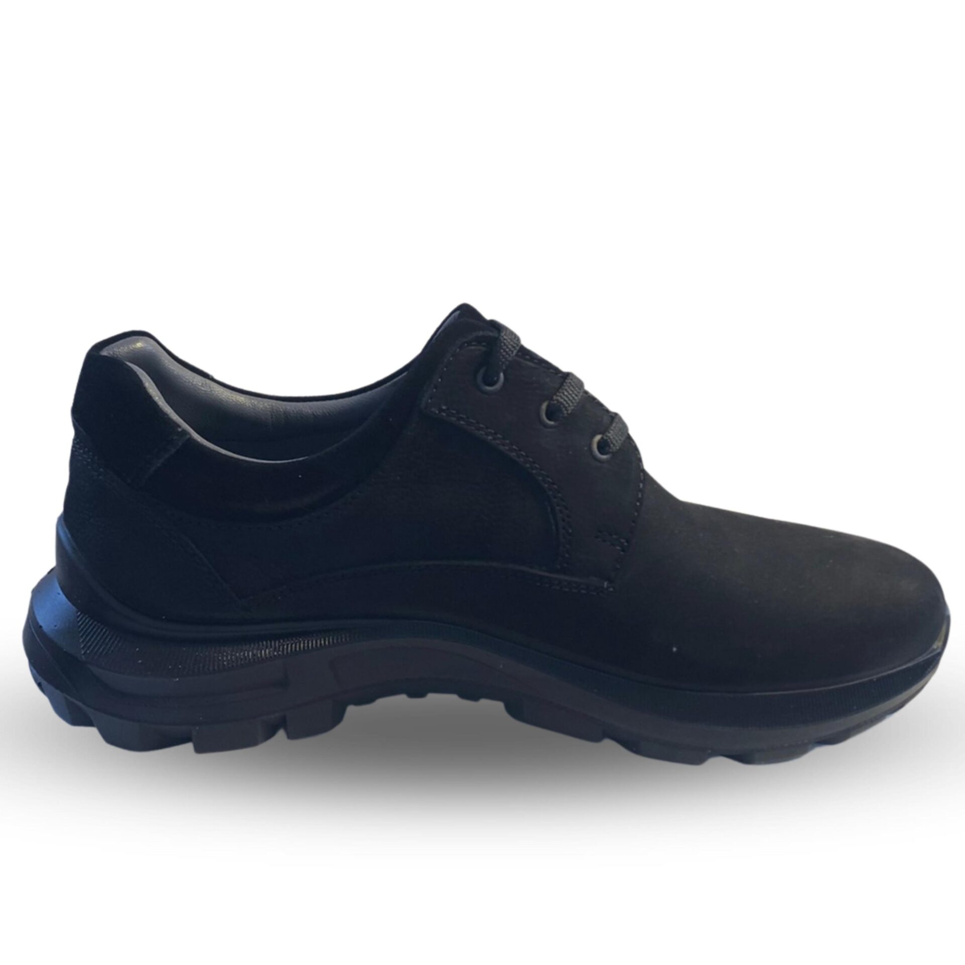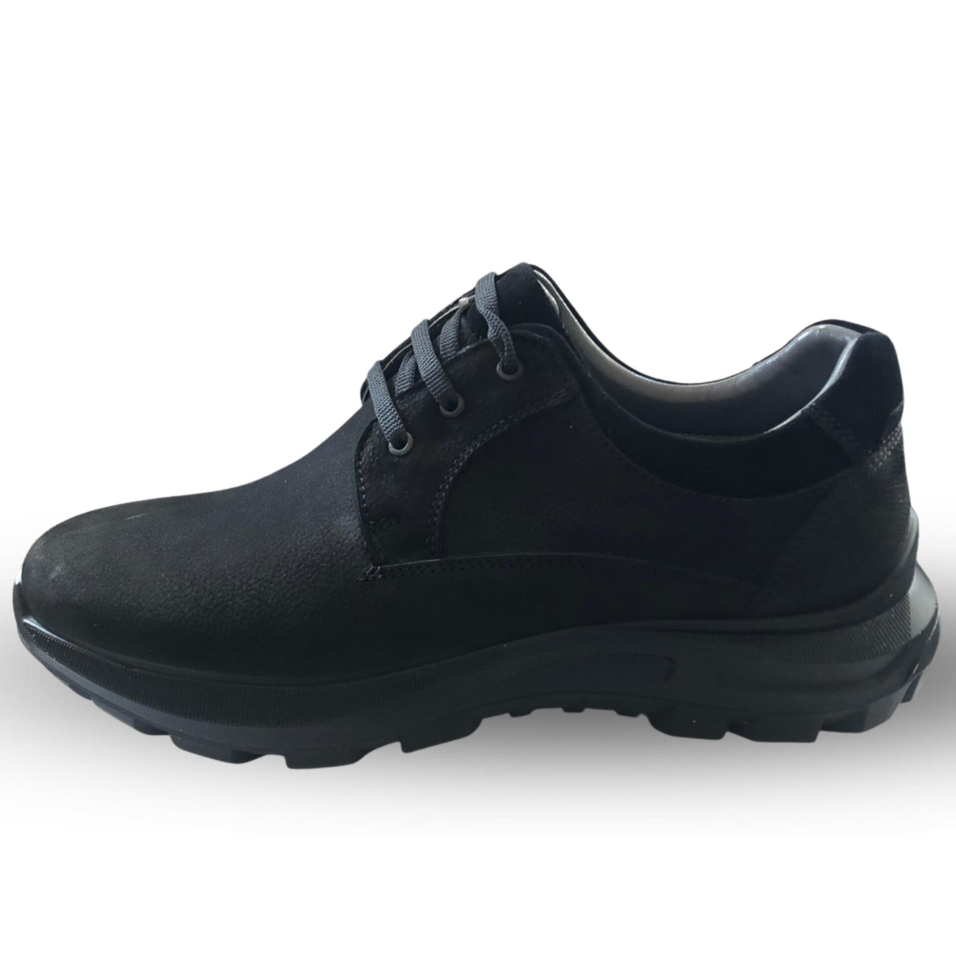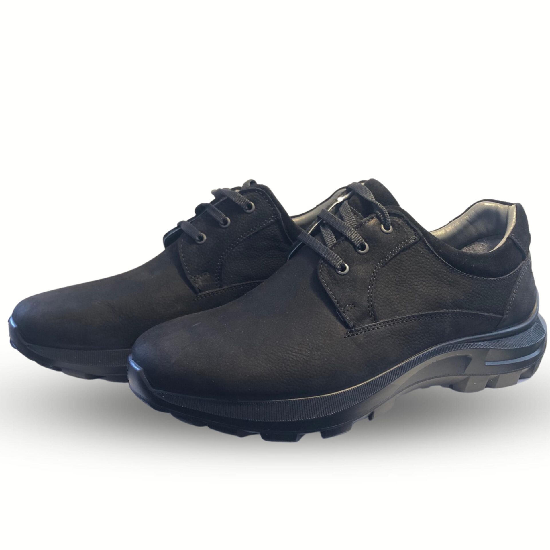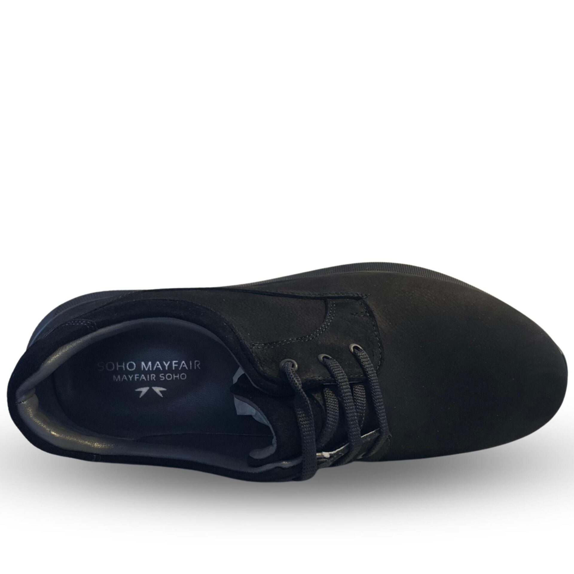 Мъжки ежедневни обувки с връзки на марката Soho Mayfair. Външната част на модела е изработен от естествен набук. Вътрешната част също е изработена от естествена кожа Дебелината на подметката в задната част е 3.5 см. Моделът е снабден с Antishokk система, която намалява напрежението стъпка по стъпка с повече от 50%. Това облекчава гръбначния стълб, междупрешленните дискове и ставите.